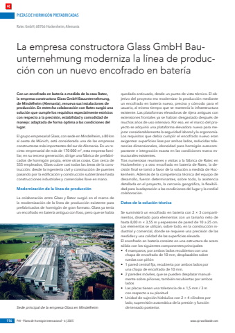 PIEZAS DE HORMIG%u00d3N PREFABRICADAS116 PHI %u2013 Planta de Hormig%u00f3n Internacional %u2013 6 | 2025 www.cpi-worldwide.comCon un encofrado en bater%u00eda a medida de la casa Ratec, la empresa constructora Glass GmbH Bauunternehmung, de Mindelheim (Alemania), renueva sus instalaciones de producci%u00f3n. En estrecha colaboraci%u00f3n con Ratec surgi%u00f3 una soluci%u00f3n que cumple los requisitos especialmente estrictos con respecto a la precisi%u00f3n, estabilidad y comodidad de manejo: adaptada de forma %u00f3ptima a las condiciones del lugar.El grupo empresarial Glass, con sede en Mindelheim, a 80 km al oeste de M%u00fanich, est%u00e1 considerada una de las empresas constructoras m%u00e1s importantes del sur de Alemania. En un recinto empresarial de m%u00e1s de 170 000 m2, esta empresa familiar, en su tercera generaci%u00f3n, dirige una f%u00e1brica de prefabricados de hormig%u00f3n propia, entre otras cosas. Con cerca de 555 empleados, Glass cubre casi todas las %u00e1reas de la construcci%u00f3n: desde la ingenier%u00eda civil y construcci%u00f3n de puentes pasando por la edificaci%u00f3n y construcci%u00f3n subterr%u00e1nea hasta construcciones industriales y comerciales llave en mano. Modernizaci%u00f3n de la l%u00ednea de producci%u00f3nLa colaboraci%u00f3n entre Glass y Ratec surgi%u00f3 en el marco de la modernizaci%u00f3n de la l%u00ednea de producci%u00f3n existente para prefabricados de hormig%u00f3n de gran formato. Glass ya ten%u00eda un encofrado en bater%u00eda antiguo con foso, pero que se hab%u00eda quedado anticuado, desde un punto de vista t%u00e9cnico. El objetivo del proyecto era modernizar la producci%u00f3n mediante un encofrado en bater%u00eda nuevo, preciso y c%u00f3modo para el usuario, al mismo tiempo que se manten%u00eda la infraestructura existente. Las plataformas elevadoras de tijera antiguas con extensiones frontales ya se hab%u00edan desgastado despu%u00e9s de muchos a%u00f1os de uso intensivo. Por eso, en el marco del proyecto se adquiri%u00f3 una plataforma elevadora nueva para mejorar considerablemente la seguridad laboral y la ergonom%u00eda.Los requisitos que deb%u00eda cumplir el encofrado nuevo eran exigentes: superficies lisas por ambos lados, reducidas tolerancias dimensionales, idoneidad para hormig%u00f3n autocompactante e integraci%u00f3n exacta en las condiciones marco estructurales existentes.Tras numerosas reuniones y visitas a la f%u00e1brica de Ratec en Hockenheim y a otro encofrado en bater%u00eda de Ratec, la decisi%u00f3n final se tom%u00f3 a favor de la soluci%u00f3n a medida de Hockenheim. Adem%u00e1s de la competencia t%u00e9cnica del equipo de desarrollo, fueron determinantes, sobre todo, la asistencia detallada en el proyecto, la cercan%u00eda geogr%u00e1fica, la flexibilidad para la adaptaci%u00f3n a las condiciones del lugar y la cordial colaboraci%u00f3n.Datos de la soluci%u00f3n t%u00e9cnica Se suministr%u00f3 un encofrado en bater%u00eda con 2 %u00d7 3 compartimentos, dise%u00f1ado para elementos con un tama%u00f1o neto de hasta 8,00 m %u00d7 3,55 m y espesores de pared de 10 a 25 cm. Los elementos se utilizan, sobre todo, en la construcci%u00f3n industrial y comercial, donde se requiere una precisi%u00f3n de las medidas y una calidad de las superficies elevada. El encofrado en bater%u00eda consiste en una estructura de acero s%u00f3lida con los siguientes componentes principales:%u2022 4 mamparos, por ambos lados recubiertos con una chapa de encofrado de 10 mm, desplazables sobre ruedas con pi%u00f1%u00f3n%u2022 1 pared central fija, recubierta por ambos lados por una chapa de encofrado de 10 mm.%u2022 2 paredes m%u00f3viles, que se pueden desplazar manualmente sobre pi%u00f1ones, tambi%u00e9n recubiertas por ambos lados%u2022 Las placas tienen una tolerancia de %u00b1 1,5 mm / 3 m con respecto a su planitud%u2022 Unidad de sujeci%u00f3n hidr%u00e1ulica con 2 %u00d7 4 cilindros por lado, supervisi%u00f3n autom%u00e1tica de la presi%u00f3n y funci%u00f3n de tensado posterior.La empresa constructora Glass GmbH Bauunternehmung moderniza la l%u00ednea de producci%u00f3n con un nuevo encofrado en bater%u00eda Ratec GmbH, 68766 Hockenheim, Alemania Sede principal de la empresa Glass en Mindelheim