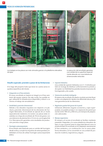 PIEZAS DE HORMIG%u00d3N PREFABRICADAS118 PHI %u2013 Planta de Hormig%u00f3n Internacional %u2013 6 | 2025 www.cpi-worldwide.comDesaf%u00edo superado: precisi%u00f3n a pesar de las limitacionesA lo largo del proyecto hubo que tener en cuenta varios requisitos espec%u00edficos del cliente:%u2022 Integraci%u00f3n en el foso existenteEl nuevo encofrado en bater%u00eda se integr%u00f3 en el foso existente del equipo anterior. De este modo, fue posible seguir utilizando la infraestructura disponible y reducir a un m%u00ednimo el trabajo de remodelaci%u00f3n.%u2022 Estabilidad y precisi%u00f3n dimensionalDebido a los elevados requisitos con respecto a la planitud y precisi%u00f3n dimensional de los elementos de hormig%u00f3n fabricados, el encofrado se ejecut%u00f3 de un modo especialmente resistente a la torsi%u00f3n. Las placas est%u00e1n revestidas con chapa de encofrado de 10 mm de grosor, con una tolerancia de planitud de %u00b11,5 mm en una longitud de 3 m. Esta ejecuci%u00f3n garantiza unos resultados de producci%u00f3n precisos a largo plazo.%u2022 Hormig%u00f3n autocompactanteEl encofrado est%u00e1 dise%u00f1ado para un vertido del hormig%u00f3n desde arriba y cumple los requisitos de estanqueidad y estabilidad a la hora de utilizar hormig%u00f3n autocompactante (HAC).%u2022 Sujeci%u00f3n hidr%u00e1ulicaUna unidad de sujeci%u00f3n hidr%u00e1ulica con 2 %u00d7 4 cilindros por lado se encarga de distribuir uniformemente la presi%u00f3n y de sujetar con fiabilidad las paredes durante el proceso de hormigonado y de curado. %u2022 Sistema de encofrado inteligenteEl sistema de encofrado de dise%u00f1o modular permite llevar a cabo una adaptaci%u00f3n r%u00e1pida a las diferentes alturas y formas geom%u00e9tricas de los elementos.%u2022 Regulaci%u00f3n gradual del grosor de la paredUtilizando diferentes %u00e1ngulos accesorios y cajas superpuestas, es posible producir con espesores de pared que oscilan entre 100 mm y 250 mm y sin tiempos de preparaci%u00f3n adicionales.%u2022 Manejo ergon%u00f3micoEl manejo y el acceso al encofrado se facilitan mediante pasarelas integradas y la nueva plataforma elevadora de tijera, lo que aumenta tanto la seguridad laboral como la productividad. El encofrado se ha adaptado exactamente al foso existente y, en combinaci%u00f3n con la nueva plataforma elevadora, se ha convertido en una unidad de producci%u00f3n moderna, ergon%u00f3mica y segura.La ejecuci%u00f3n del encofrado garantiza una calidad de la superficie especialmente elevada con unas tolerancias dimensionales reducidasLos trabajos en las placas son m%u00e1s c%u00f3modos gracias a la plataforma elevadora de tijera