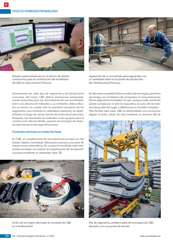 PIEZAS DE HORMIG%u00d3N PREFABRICADAS124 PHI %u2013 Planta de Hormig%u00f3n Internacional %u2013 6 | 2025 www.cpi-worldwide.comdimensiones de cada tipo de segmento y las limitaciones concretas del t%u00fanel, CBE define tolerancias extremadamente reducidas para las dimensiones de sus encofrados: entre una d%u00e9cima de mil%u00edmetro y un mil%u00edmetro. Estos c%u00e1lculos no tienen en cuenta solo la exactitud necesaria de los segmentos, sino tambi%u00e9n la viabilidad industrial y la repetibilidad a lo largo de varios cientos de ciclos de producci%u00f3n. Despu%u00e9s, los resultados se trasladan a los equipos para la construcci%u00f3n del encofrado, quienes se encargan de respetar estrictamente las especificaciones.Controles estrictos en todas las fasesEn CBE, el cumplimiento de las tolerancias se basa en tres pilares: dise%u00f1o controlado, fabricaci%u00f3n precisa y una serie de inspecciones sistem%u00e1ticas. En cuanto el encofrado est%u00e1 totalmente montado, se controla el cumplimiento de las especificaciones mediante un rastreador l%u00e1ser 3D.En esta fase es posible fabricar anillos de hormig%u00f3n para fines de ensayo, con el objetivo de comprobar el comportamiento de los segmentos montados. Ya que, aunque cada una de las piezas cumpla por s%u00ed sola los requisitos, la suma de las tolerancias puede dar lugar a diferencias en el anillo completo.Para facilitar este paso, CBE ha desarrollado una innovaci%u00f3n digital: el anillo virtual. Se crea mediante un escaneo 3D de Anillo de hormig%u00f3n fabricado en la planta de CBE en L%u2019Ile-BouchardPila de segmentos prefabricados de hormig%u00f3n de CBE, elevados con una pinza de AcimexEstudio sobre tolerancias en la oficina de dise%u00f1o constructivo para la construcci%u00f3n de encofrados de CBE en Saint-Avertin (Francia)Inspecci%u00f3n de un encofrado para segmentos con un rastreador l%u00e1ser en la planta de producci%u00f3n de L%u2019Ile-Bouchard (Francia)