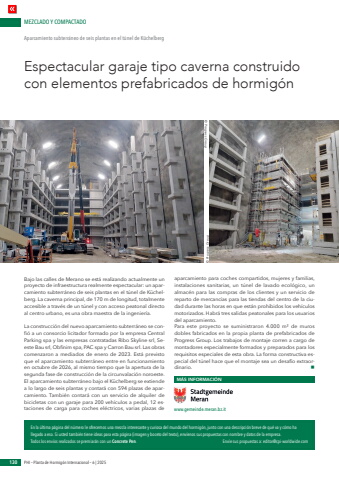 MEZCLADO Y COMPACTADOPHI %u2013 Planta de Hormig%u00f3n Internacional %u2013 6 | 2025En la %u00faltima p%u00e1gina del n%u00famero le ofrecemos una mezcla interesante y curiosa del mundo del hormig%u00f3n, junto con una descripci%u00f3n breve de qu%u00e9 va y c%u00f3mo ha llegado a eso. Si usted tambi%u00e9n tiene ideas para esta p%u00e1gina (imagen y boceto del texto), env%u00edenos sus propuestas con nombre y datos de la empresa. Todos los env%u00edos realizados se premiar%u00e1n con un Concrete Pen. Env%u00ede sus propuestas a: editor@cpi-worldwide.com130Espectacular garaje tipo caverna construido con elementos prefabricados de hormig%u00f3nAparcamiento subterr%u00e1neo de seis plantas en el t%u00fanel de K%u00fcchelbergBajo las calles de Merano se est%u00e1 realizando actualmente un proyecto de infraestructura realmente espectacular: un aparcamiento subterr%u00e1neo de seis plantas en el t%u00fanel de K%u00fcchelberg. La caverna principal, de 170 m de longitud, totalmente accesible a trav%u00e9s de un t%u00fanel y con acceso peatonal directo al centro urbano, es una obra maestra de la ingenier%u00eda.La construcci%u00f3n del nuevo aparcamiento subterr%u00e1neo se confi%u00f3 a un consorcio licitador formado por la empresa Central Parking spa y las empresas contratadas Ribo Skyline srl, Seeste Bau srl, Obfinim spa, PAC spa y Carron Bau srl. Las obras comenzaron a mediados de enero de 2023. Est%u00e1 previsto que el aparcamiento subterr%u00e1neo entre en funcionamiento en octubre de 2026, al mismo tiempo que la apertura de la segunda fase de construcci%u00f3n de la circunvalaci%u00f3n noroeste. El aparcamiento subterr%u00e1neo bajo el K%u00fcchelberg se extiende a lo largo de seis plantas y contar%u00e1 con 594 plazas de aparcamiento. Tambi%u00e9n contar%u00e1 con un servicio de alquiler de bicicletas con un garaje para 200 veh%u00edculos a pedal, 12 estaciones de carga para coches el%u00e9ctricos, varias plazas de aparcamiento para coches compartidos, mujeres y familias, instalaciones sanitarias, un t%u00fanel de lavado ecol%u00f3gico, un almac%u00e9n para las compras de los clientes y un servicio de reparto de mercanc%u00edas para las tiendas del centro de la ciudad durante las horas en que est%u00e1n prohibidos los veh%u00edculos motorizados. Habr%u00e1 tres salidas peatonales para los usuarios del aparcamiento.Para este proyecto se suministraron 4.000 m%u00b2 de muros dobles fabricados en la propia planta de prefabricados de Progress Group. Los trabajos de montaje corren a cargo de montadores especialmente formados y preparados para los requisitos especiales de esta obra. La forma constructiva especial del t%u00fanel hace que el montaje sea un desaf%u00edo extraordinario. nM%u00c1S INFORMACI%u00d3Nwww.gemeinde.meran.bz.it %u00a9 Progress Group %u00a9 Progress Group