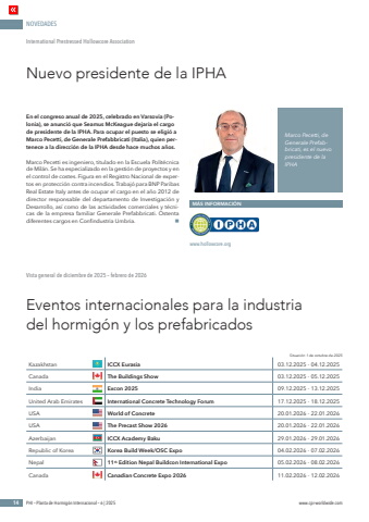 NOVEDADES14 PHI %u2013 Planta de Hormig%u00f3n Internacional %u2013 6 | 2025 www.cpi-worldwide.comEn el congreso anual de 2025, celebrado en Varsovia (Polonia), se anunci%u00f3 que Seamus McKeague dejar%u00eda el cargo de presidente de la IPHA. Para ocupar el puesto se eligi%u00f3 a Marco Pecetti, de Generale Prefabbricati (Italia), quien pertenece a la direcci%u00f3n de la IPHA desde hace muchos a%u00f1os.Marco Pecetti es ingeniero, titulado en la Escuela Polit%u00e9cnica de Mil%u00e1n. Se ha especializado en la gesti%u00f3n de proyectos y en el control de costes. Figura en el Registro Nacional de expertos en protecci%u00f3n contra incendios. Trabaj%u00f3 para BNP Paribas Real Estate Italy antes de ocupar el cargo en el a%u00f1o 2012 de director responsable del departamento de Investigaci%u00f3n y Desarrollo, as%u00ed como de las actividades comerciales y t%u00e9cnicas de la empresa familiar Generale Prefabbricati. Ostenta diferentes cargos en Confindustria Umbria. nNuevo presidente de la IPHAInternational Prestressed Hollowcore AssociationM%u00c1S INFORMACI%u00d3Nwww.hollowcore.orgMarco Pecetti, de Generale Prefabbricati, es el nuevo presidente de la IPHAKazakhstan ICCX Eurasia 03.12.2025 - 04.12.2025Canada The Buildings Show 03.12.2025 - 05.12.2025India Excon 2025 09.12.2025 - 13.12.2025United Arab Emirates International Concrete Technology Forum 17.12.2025 - 18.12.2025USA World of Concrete 20.01.2026 - 22.01.2026USA The Precast Show 2026 20.01.2026 - 22.01.2026Azerbaijan ICCX Academy Baku 29.01.2026 - 29.01.2026Republic of Korea Korea Build Week/OSC Expo 04.02.2026 - 07.02.2026Nepal 11th Edition Nepal Buildcon International Expo 05.02.2026 - 08.02.2026Canada Canadian Concrete Expo 2026 11.02.2026 - 12.02.2026Eventos internacionales para la industriadel hormig%u00f3n y los prefabricadosVista general de diciembre de 2025 %u2013 febrero de 2026Situaci%u00f3n 1 de octubre de 2025