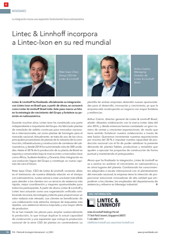 NOVEDADES16 PHI %u2013 Planta de Hormig%u00f3n Internacional %u2013 6 | 2025 www.cpi-worldwide.comLintec & Linnhoff ha finalizado oficialmente su integraci%u00f3n con Lintec-Ixon en Brasil que, a partir de ahora, se conocer%u00e1 como Lintec & Linnhoff Brasil Ltda. Este paso marca un hito en la estrategia de crecimiento del Grupo y fortalece su posici%u00f3n en Latinoam%u00e9rica. Durante muchos a%u00f1os, Lintec-Ixon ha constituido una parte independiente e importante del Grupo. Ha fabricado plantas de mezclado de asfalto continuas para mercados nacionales e internacionales, as%u00ed como plantas de hormig%u00f3n para el mercado nacional. Actualmente, se trata de uno de los cinco principales proveedores de plantas de la industria de la construcci%u00f3n, infraestructuras y construcci%u00f3n de carreteras de Latinoam%u00e9rica, y desde 2014 ha suministrado m%u00e1s de 300 unidades. Hasta el 30 % de la producci%u00f3n de su planta de Brasil se exporta y comercializa bajo la marca Lintec a mercados clave como %u00c1frica, Sudeste Asi%u00e1tico y Ocean%u00eda. Esta integraci%u00f3n es una evoluci%u00f3n l%u00f3gica del Grupo y constituye un nuevo cap%u00edtulo de cara al futuro.Peter Isaac Chan, CEO de Lintec & Linnhoff, comenta: %u00abEsto es el testimonio de nuestra dilatada relaci%u00f3n en el tiempo con Latinoam%u00e9rica. Juntos vamos a crear una base m%u00e1s s%u00f3lida para atender a los clientes con un servicio de asistencia m%u00e1s r%u00e1pido, mejor coordinaci%u00f3n y mayores oportunidades para todos los participantes. A partir de ahora, Lintec & Linnhoff y Lintec Ixon actuar%u00e1n como una organizaci%u00f3n unificada combinando recursos, tecnolog%u00edas y talento para proporcionar un valor todav%u00eda m%u00e1s elevado. Los clientes se beneficiar%u00e1n de una colaboraci%u00f3n m%u00e1s estrecha, tiempos de respuestas m%u00e1s r%u00e1pidos, una asistencia t%u00e9cnica mejorada y una mayor oferta de productos. Ya se han trazado los planes para ampliar sustancialmente la producci%u00f3n, lo que incluye duplicar la actual capacidad de construcci%u00f3n y una expansi%u00f3n que incluye la producci%u00f3n nacional de la serie CSD de plantas en contenedores. La plantilla de ambas empresas obtendr%u00e1 nuevas oportunidades para el desarrollo, innovaci%u00f3n y crecimiento, ya que la empresa est%u00e1 construyendo un negocio con mayor fortaleza y resiliencia%u00bb.Arthur Cotrim, director general de Lintec & Linnhoff Brasil, a%u00f1ade: %u00abNuestra colaboraci%u00f3n con la marca Lintec data del a%u00f1o 2014, y desde entonces hemos constatado un gran n%u00famero de ventas y crecientes exportaciones, de modo que tiene sentido fortalecer nuestra colaboraci%u00f3n a trav%u00e9s de esta fusi%u00f3n. Queremos incrementar nuestras exportaciones por encima del 30 % e impulsar nuestra capacidad de producci%u00f3n nacional con el fin de poder satisfacer la presente demanda de plantas fiables, productivas y rentables que ayuden a ejecutar los proyectos de construcci%u00f3n de forma puntual y manteniendo el presupuesto%u00bb.Ahora que ha finalizado la integraci%u00f3n, Lintec & Linnhoff se va a centrar en acelerar el crecimiento en Latinoam%u00e9rica y en otros lugares del planeta. Combinando los conocimientos adquiridos a escala internacional con el planteamiento del mercado nacional, la empresa tiene la intenci%u00f3n de proporcionar soluciones innovadoras de alta calidad que empoderen a los clientes, los empleados del departamento de asistencia y refuerce su liderazgo industrial. nLintec & Linnhoff incorpora a Lintec-Ixon en su red mundialLa integraci%u00f3n marca una expansi%u00f3n fundamental hacia Latinoam%u00e9ricaM%u00c1S INFORMACI%u00d3NLintec & Linnhoff Holdings Pte Ltd 71 Tech Park Crescent, Singapore 638072 T +65 6863 1111 info@lintec-linnhoff.com, www.lintec-linnhoff.comPeter Isaac Chan, Group CEO de Lintec & Linnhoff Arthur Cotrim, Managing Director deLintec & Linnhoff Brasil