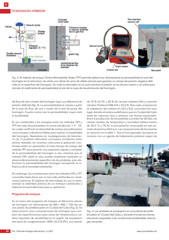 TECNOLOGIA DEL HORMIG%u00d3N20 PHI %u2013 Planta de Hormig%u00f3n Internacional %u2013 6 | 2025 www.cpi-worldwide.comde flujo de aire a trav%u00e9s del hormig%u00f3n bajo una diferencia de presi%u00f3n definida (fig. 2). La permeabilidad se calcula a partir de la tasa de flujo de aire a trav%u00e9s de la red de poros del hormig%u00f3n. Cuanto menor sea la permeabilidad, mayor ser%u00e1 la durabilidad.El uso combinado y las sinergias entre los m%u00e9todos OPI y TPT han sido documentados en varios estudios [6, 7, 9 - 13], los cuales confirman la idoneidad de ambos procedimientos como ensayos indicativos fiables para evaluar la durabilidad del hormig%u00f3n. Bas%u00e1ndose en investigaciones de laboratorio, [6, 7] pudieron demostrar una buena correlaci%u00f3n entre ambos m%u00e9todos. Un incentivo clave para la aplicaci%u00f3n combinada radica en aprovechar el corto tiempo de ensayo del m%u00e9todo TPT para permitir una evaluaci%u00f3n r%u00e1pida y completa de la permeabilidad del hormig%u00f3n in situ, mientras que el m%u00e9todo OPI, dado el caso, puede emplearse mediante un preacondicionamiento espec%u00edfico de las probetas, para determinar la permeabilidad del hormig%u00f3n excluyendo la influencia de la humedad ambiental.Sin embargo, las correlaciones entre los m%u00e9todos OPI y TPT conocidas hasta ahora a%u00fan no han sido verificadas en condiciones pr%u00e1cticas. El objetivo de este trabajo es, por lo tanto, analizar la viabilidad pr%u00e1ctica de un enfoque combinado y elaborar recomendaciones para su aplicaci%u00f3n.Programa de ensayosEn el marco del programa de ensayos se fabricaron placas de hormig%u00f3n con dimensiones de 600 %u00d7 400 %u00d7 150 mm en una planta de prefabricados en Ciudad del Cabo (fig. 3). Se seleccionaron cinco composiciones de hormig%u00f3n que cumplen las especificaciones para obras de infraestructura con altos requisitos de durabilidad en la regi%u00f3n. Se emplearon tres tipos de conglomerante: CEM I 52,5 N (PC), una mezcla de 70 % de PC y 30 % de cenizas volantes (FA) y cemento calc%u00e1reo Portland CEM II/A-L 52,5 N. Para cada composici%u00f3n se adoptaron dos valores a/c (0,5 y 0,6). La producci%u00f3n tuvo lugar durante el verano sudafricano, que en Ciudad del Cabo suele ser caluroso, seco y ventoso, con lluvias ocasionales. Entre la producci%u00f3n de las probetas y la edad de 28 d%u00edas, los valores medios de temperatura y humedad relativa fueron de 20,3 %u00b0C y 70 %; la precipitaci%u00f3n acumulada en ese periodo alcanz%u00f3 los 24,4 mm. Las composiciones de las mezclas se resumen en la tabla 1. Tras el hormigonado, las placas se rociaron con un agente de tratamiento posterior seg%u00fan las Fig. 2: El m%u00e9todo de ensayo Torrent Permeability Tester (TPT) permite determinar directamente la permeabilidad al aire del hormig%u00f3n en la estructura. Se utiliza una c%u00e9lula de vac%u00edo de doble c%u00e1mara para generar un campo de presi%u00f3n negativa definido en la superficie del hormig%u00f3n. Se mide la velocidad con la que aumenta la presi%u00f3n en la c%u00e1mara interior y se utiliza para calcular el coeficiente de permeabilidad al aire de la capa de recubrimiento del hormig%u00f3n.Fig. 3: Las probetas se produjeron en una planta de prefabricados en Ciudad del Cabo y, durante el endurecimiento, estuvieron expuestas a las condiciones ambientales veraniegas reinantes.
