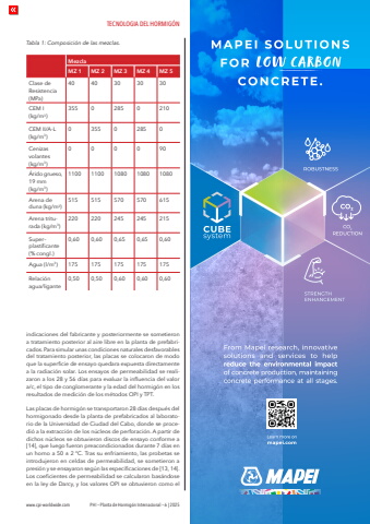 TECNOLOGIA DEL HORMIG%u00d3Nwww.cpi-worldwide.com PHI %u2013 Planta de Hormig%u00f3n Internacional %u2013 6 | 2025indicaciones del fabricante y posteriormente se sometieron a tratamiento posterior al aire libre en la planta de prefabricados. Para simular unas condiciones naturales desfavorables del tratamiento posterior, las placas se colocaron de modo que la superficie de ensayo quedara expuesta directamente a la radiaci%u00f3n solar. Los ensayos de permeabilidad se realizaron a los 28 y 56 d%u00edas para evaluar la influencia del valor a/c, el tipo de conglomerante y la edad del hormig%u00f3n en los resultados de medici%u00f3n de los m%u00e9todos OPI y TPT.Las placas de hormig%u00f3n se transportaron 28 d%u00edas despu%u00e9s del hormigonado desde la planta de prefabricados al laboratorio de la Universidad de Ciudad del Cabo, donde se procedi%u00f3 a la extracci%u00f3n de los n%u00facleos de perforaci%u00f3n. A partir de dichos n%u00facleos se obtuvieron discos de ensayo conforme a [14], que luego fueron preacondicionados durante 7 d%u00edas en un horno a 50 %u00b1 2 %u00b0C. Tras su enfriamiento, las probetas se introdujeron en celdas de permeabilidad, se sometieron a presi%u00f3n y se ensayaron seg%u00fan las especificaciones de [13, 14]. Los coeficientes de permeabilidad se calcularon bas%u00e1ndose en la ley de Darcy, y los valores OPI se obtuvieron como el Tabla 1: Composici%u00f3n de las mezclas.MezclaMZ 1 MZ 2 MZ 3 MZ 4 MZ 5Clase de Resistencia (MPa)40 40 30 30 30CEM I (kg/m3)355 0 285 0 210CEM II/A-L (kg/m3)0 355 0 285 0Cenizas volantes (kg/m3)0 0 0 0 90%u00c1rido grueso, 19 mm (kg/m3)1100 1100 1080 1080 1080Arena de duna (kg/m3)515 515 570 570 615Arena triturada (kg/m3)220 220 245 245 215Super%u2013plastificante (% congl.)0,60 0,60 0,65 0,65 0,60Agua (l/m3) 175 175 175 175 175Relaci%u00f3n agua/ligante0,50 0,50 0,60 0,60 0,60