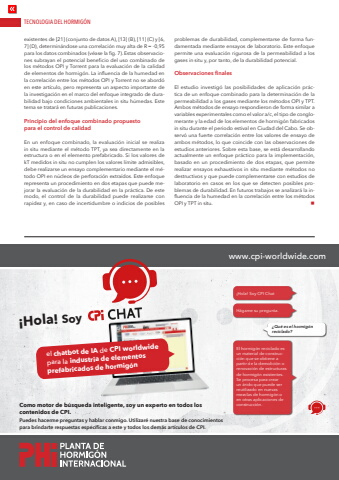 TECNOLOGIA DEL HORMIG%u00d3N24 PHI %u2013 Planta de Hormig%u00f3n Internacional %u2013 6 | 2025 www.cpi-worldwide.comexistentes de [21] (conjunto de datos A), [13] (B), [11] (C) y [6, 7] (D), determin%u00e1ndose una correlaci%u00f3n muy alta de R = -0,95 para los datos combinados (v%u00e9ase la fig. 7). Estas observaciones subrayan el potencial beneficio del uso combinado de los m%u00e9todos OPI y Torrent para la evaluaci%u00f3n de la calidad de elementos de hormig%u00f3n. La influencia de la humedad en la correlaci%u00f3n entre los m%u00e9todos OPI y Torrent no se abord%u00f3 en este art%u00edculo, pero representa un aspecto importante de la investigaci%u00f3n en el marco del enfoque integrado de durabilidad bajo condiciones ambientales in situ h%u00famedas. Este tema se tratar%u00e1 en futuras publicaciones. Principio del enfoque combinado propuesto para el control de calidadEn un enfoque combinado, la evaluaci%u00f3n inicial se realiza in situ mediante el m%u00e9todo TPT, ya sea directamente en la estructura o en el elemento prefabricado. Si los valores de kT medidos in situ no cumplen los valores l%u00edmite admisibles, debe realizarse un ensayo complementario mediante el m%u00e9todo OPI en n%u00facleos de perforaci%u00f3n extra%u00eddos. Este enfoque representa un procedimiento en dos etapas que puede mejorar la evaluaci%u00f3n de la durabilidad en la pr%u00e1ctica. De este modo, el control de la durabilidad puede realizarse con rapidez y, en caso de incertidumbre o indicios de posibles problemas de durabilidad, complementarse de forma fundamentada mediante ensayos de laboratorio. Este enfoque permite una evaluaci%u00f3n rigurosa de la permeabilidad a los gases in situ y, por tanto, de la durabilidad potencial.Observaciones finalesEl estudio investig%u00f3 las posibilidades de aplicaci%u00f3n pr%u00e1ctica de un enfoque combinado para la determinaci%u00f3n de la permeabilidad a los gases mediante los m%u00e9todos OPI y TPT. Ambos m%u00e9todos de ensayo respondieron de forma similar a variables experimentales como el valor a/c, el tipo de conglomerante y la edad de los elementos de hormig%u00f3n fabricados in situ durante el periodo estival en Ciudad del Cabo. Se observ%u00f3 una fuerte correlaci%u00f3n entre los valores de ensayo de ambos m%u00e9todos, lo que coincide con las observaciones de estudios anteriores. Sobre esta base, se est%u00e1 desarrollando actualmente un enfoque pr%u00e1ctico para la implementaci%u00f3n, basado en un procedimiento de dos etapas, que permite realizar ensayos exhaustivos in situ mediante m%u00e9todos no destructivos y que puede complementarse con estudios de laboratorio en casos en los que se detecten posibles problemas de durabilidad. En futuros trabajos se analizar%u00e1 la influencia de la humedad en la correlaci%u00f3n entre los m%u00e9todos OPI y TPT in situ. nwww.cpi-worldwide.com%u00a1Hola! SoyComo motor de b%u00fasqueda inteligente, soy un experto en todos los contenidos de CPI. Puedes hacerme preguntas y hablar conmigo. Utilizar%u00e9 nuestra base de conocimientos para brindarte respuestas espec%u00edficas a este y todos los dem%u00e1s art%u00edculos de CPI.el chatbot de IA de CPI worldwide para la industria de elementos prefabricados de hormig%u00f3nH%u00e1game su pregunta.%u00a1Hola! Soy CPI Chat%u00bfQu%u00e9 es el hormig%u00f3n reciclado?El hormig%u00f3n reciclado es un material de construcci%u00f3n que se obtiene a partir de la demolici%u00f3n o renovaci%u00f3n de estructuras de hormig%u00f3n existentes. Se procesa para crear un %u00e1rido que puede ser reutilizado en nuevas mezclas de hormig%u00f3n o en otras aplicaciones de construcci%u00f3n.