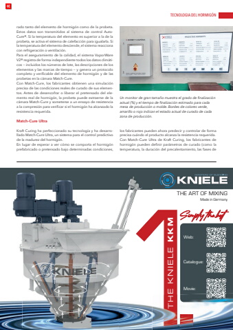 TECNOLOGIA DEL HORMIG%u00d3Nwww.cpi-worldwide.com PHI %u2013 Planta de Hormig%u00f3n Internacional %u2013 6 | 2025 27rado tanto del elemento de hormig%u00f3n como de la probeta. Estos datos son transmitidos al sistema de control AutoCure%u00ae. Si la temperatura del elemento es superior a la de la probeta, se activa el sistema de calefacci%u00f3n para igualarla. Si la temperatura del elemento desciende, el sistema reacciona con refrigeraci%u00f3n o ventilaci%u00f3n.Para el aseguramiento de la calidad, el sistema VaporWare V2%u00ae registra de forma independiente todos los datos clim%u00e1ticos %u2014 incluidos los n%u00fameros de lote, las descripciones de los elementos y las marcas de tiempo %u2014 y genera un protocolo completo y verificable del elemento de hormig%u00f3n y de las probetas en la c%u00e1mara Match-Cure.Con Match-Cure, los fabricantes obtienen una simulaci%u00f3n precisa de las condiciones reales de curado de sus elementos. Antes de desencofrar o liberar el pretensado del elemento real de hormig%u00f3n, la probeta puede extraerse de la c%u00e1mara Match-Cure y someterse a un ensayo de resistencia a la compresi%u00f3n para verificar si el hormig%u00f3n ha alcanzado la resistencia requerida.Match-Cure Ultra Kraft Curing ha perfeccionado su tecnolog%u00eda y ha desarrollado Match-Cure Ultra, un sistema para el control predictivo de la madurez del hormig%u00f3n.En lugar de esperar a ver c%u00f3mo se comporta el hormig%u00f3n prefabricado o pretensado bajo determinadas condiciones, los fabricantes pueden ahora predecir y controlar de forma precisa cu%u00e1ndo el producto alcanza la resistencia requerida.Con Match-Cure Ultra de Kraft Curing, los fabricantes de hormig%u00f3n pueden definir par%u00e1metros de curado (como la temperatura, la duraci%u00f3n del precalentamiento, las fases de Un monitor de gran tama%u00f1o muestra el grado de finalizaci%u00f3n actual (%) y el tiempo de finalizaci%u00f3n estimado para cada mesa de producci%u00f3n o molde. Bordes de colores verde, amarillo o rojo indican el estado actual de curado de cada zona de producci%u00f3n.THE KNIELE KKMWeb:Catalogue:Movie:THE ART OF MIXINGMade in Germany