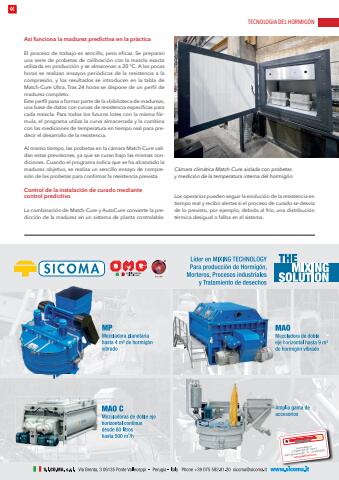 TECNOLOGIA DEL HORMIG%u00d3Nwww.cpi-worldwide.com PHI %u2013 Planta de Hormig%u00f3n Internacional %u2013 6 | 2025 29As%u00ed funciona la madurez predictiva en la pr%u00e1cticaEl proceso de trabajo es sencillo, pero eficaz. Se preparan una serie de probetas de calibraci%u00f3n con la mezcla exacta utilizada en producci%u00f3n y se almacenan a 20 %u00b0C. A las pocas horas se realizan ensayos peri%u00f3dicos de la resistencia a la compresi%u00f3n, y los resultados se introducen en la tabla de Match-Cure Ultra. Tras 24 horas se dispone de un perfil de madurez completo.Este perfil pasa a formar parte de la %u00abbiblioteca de madurez%u00bb, una base de datos con curvas de resistencia espec%u00edficas para cada mezcla. Para todos los futuros lotes con la misma f%u00f3rmula, el programa utiliza la curva almacenada y la combina con las mediciones de temperatura en tiempo real para predecir el desarrollo de la resistencia.Al mismo tiempo, las probetas en la c%u00e1mara Match-Cure validan estas previsiones, ya que se curan bajo las mismas condiciones. Cuando el programa indica que se ha alcanzado la madurez objetivo, se realiza un sencillo ensayo de compresi%u00f3n de las probetas para confirmar la resistencia prevista.Control de la instalaci%u00f3n de curado mediante control predictivo La combinaci%u00f3n de Match-Cure y AutoCure convierte la predicci%u00f3n de la madurez en un sistema de planta controlable. Los operarios pueden seguir la evoluci%u00f3n de la resistencia en tiempo real y recibir alertas si el proceso de curado se desv%u00eda de lo previsto, por ejemplo, debido al fr%u00edo, una distribuci%u00f3n t%u00e9rmica desigual o fallos en el sistema.C%u00e1mara clim%u00e1tica Match-Cure aislada con probetas y medici%u00f3n de la temperatura interna del hormig%u00f3n.