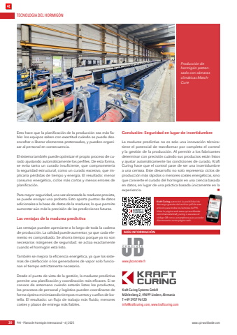 TECNOLOGIA DEL HORMIG%u00d3N30 PHI %u2013 Planta de Hormig%u00f3n Internacional %u2013 6 | 2025 www.cpi-worldwide.comEsto hace que la planificaci%u00f3n de la producci%u00f3n sea m%u00e1s fiable: los equipos saben con exactitud cu%u00e1ndo se puede desencofrar o liberar elementos pretensados, y pueden organizar al personal en consecuencia.El sistema tambi%u00e9n puede optimizar el propio proceso de curado ajustando autom%u00e1ticamente los perfiles. De esta forma, se evita tanto un curado insuficiente, que comprometer%u00eda la seguridad estructural, como un curado excesivo, que implicar%u00eda p%u00e9rdidas de tiempo y energ%u00eda. El resultado: menor consumo energ%u00e9tico, ciclos m%u00e1s cortos y menos errores de planificaci%u00f3n.Para mayor seguridad, una vez alcanzada la madurez prevista, se puede ensayar una probeta. Esto aporta puntos de datos adicionales a la base de datos de la madurez, lo que permite aumentar a%u00fan m%u00e1s la precisi%u00f3n de las predicciones futuras.Las ventajas de la madurez predictivaLas ventajas pueden apreciarse a lo largo de toda la cadena de producci%u00f3n. La calidad puede aumentar, ya que cada elemento es comprobado. Se ahorra tiempo porque ya no son necesarios m%u00e1rgenes de seguridad: se act%u00faa exactamente cuando el hormig%u00f3n est%u00e1 listo.Tambi%u00e9n se mejora la eficiencia energ%u00e9tica, ya que los sistemas de calefacci%u00f3n o los generadores de vapor solo funcionan el tiempo estrictamente necesario.Desde el punto de vista de la gesti%u00f3n, la madurez predictiva permite una planificaci%u00f3n y coordinaci%u00f3n m%u00e1s eficaces. Si se conoce de antemano cu%u00e1ndo estar%u00e1n listos los productos, los procesos de personal y log%u00edstica pueden coordinarse de forma %u00f3ptima minimizando tiempos muertos y cuellos de botella. El resultado: un flujo de trabajo m%u00e1s fluido, menores costes y plazos de entrega m%u00e1s fiables.Conclusi%u00f3n: Seguridad en lugar de incertidumbreLa madurez predictiva no es solo una innovaci%u00f3n t%u00e9cnica: tiene el potencial de transformar por completo el control y la gesti%u00f3n de la producci%u00f3n. Al permitir a los fabricantes determinar con precisi%u00f3n cu%u00e1ndo sus productos est%u00e1n listos y ajustar autom%u00e1ticamente las condiciones de curado, Kraft Curing hace que el control pase de ser una incertidumbre a una certeza. Este desarrollo no solo representa ciclos de producci%u00f3n m%u00e1s r%u00e1pidos o menores costes energ%u00e9ticos, sino que convierte el curado del hormig%u00f3n en una ciencia basada en datos, en lugar de una pr%u00e1ctica basada %u00fanicamente en la experiencia. nM%u00c1S INFORMACI%u00d3Nwww.jbconcrete.frKraft Curing Systems GmbH M%u00fchlenberg 2, 49699 Lindern, Alemania T +49 5957 96120 info@kraftcuring.com, www.kraftcuring.comKraft Curing patrocin%u00f3 la posibilidad de descarga gratuita del archivo pdf de este art%u00edculo para todos los lectores de PHI. Visite la p%u00e1gina web www.cpi-worldwide.com/channels/kraft_curing o escanee el c%u00f3digo QR con su smartphone para accederdirectamente a esta p%u00e1gina web.Producci%u00f3n de hormig%u00f3n pretensado con c%u00e1maras clim%u00e1ticas MatchCure