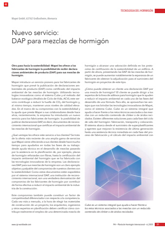 TECNOLOGIA DEL HORMIG%u00d3Nwww.cpi-worldwide.com PHI %u2013 Planta de Hormig%u00f3n Internacional %u2013 6 | 2025 31Otro paso hacia la sostenibilidad: Mapei les ofrece a los fabricantes de hormig%u00f3n la posibilidad de recibir declaraciones ambientales de producto (DAP) para sus mezclas de hormig%u00f3n.Mapei introduce un servicio pionero para los fabricantes de hormig%u00f3n que prev%u00e9 la publicaci%u00f3n de declaraciones ambientales de producto (DAP) como certificado del impacto ambiental de las mezclas de hormig%u00f3n. Utilizando tecnolog%u00edas innovadoras como el sistema Cube y el m%u00e9todo del balance ecol%u00f3gico (An%u00e1lisis de Ciclo de Vida, ACV), este servicio contribuye a reducir la huella de CO2 del hormig%u00f3n y, al mismo tiempo, mantener unos niveles de calidad elevados. En el marco de su compromiso con la sostenibilidad y la ayuda que presta Mapei a sus colaboradores desde hace a%u00f1os, recientemente, la empresa ha introducido un nuevo servicio para los fabricantes de hormig%u00f3n: la posibilidad de publicar declaraciones DAP, es decir, documentos de reconocimiento internacional que certifican el impacto ambiental de las mezclas de hormig%u00f3n.%u00bfQu%u00e9 ventajas les ofrece este servicio a los clientes? Se tratade la oferta m%u00e1s reciente de una amplia gama de servicios que Mapei viene ofreciendo a sus clientes desde hace mucho tiempo para ayudarlos en todas las fases de su trabajo: desde ayuda t%u00e9cnica en el desarrollo de mezclas pasando por la asistencia en la planificaci%u00f3n de, por ejemplo, placas de hormig%u00f3n reforzadas con fibras, hasta la certificaci%u00f3n del impacto ambiental del hormig%u00f3n que se ha fabricado con las tecnolog%u00edas innovadoras de la empresa. Las declaraciones DAP para sus mezclas de hormig%u00f3n son un claro ejemplo objetivo y palpable del compromiso de nuestros clientes con la sostenibilidad. Como estos documentos est%u00e1n expedidos por el sistema internacional DAP, una instituci%u00f3n de reconocimiento internacional, son una verdadera demostraci%u00f3n del compromiso de los fabricantes de hormig%u00f3n por contribuir de forma efectiva a reducir el impacto ambiental de la industria de la construcci%u00f3n.Este compromiso tambi%u00e9n puede constituir un factor de competitividad diferenciador con respecto a la competencia. Cada vez m%u00e1s a menudo, a la hora de elegir los materiales de construcci%u00f3n de un proyecto, los arquitectos, ingenieros y otros expertos en planificaci%u00f3n deben certificar c%u00f3mo contribuye realmente el empleo de una determinada mezcla de hormig%u00f3n a alcanzar una valoraci%u00f3n definida en los protocolos de certificaci%u00f3n de la sostenibilidad de un edificio. A partir de ahora, presentando las DAP de las mezclas de hormig%u00f3n, se puede aumentar notablemente la esperanza de un fabricante de obtener la adjudicaci%u00f3n para el suministro del hormig%u00f3n en proyectos de este tipo.%u00bfC%u00f3mo puede obtener un cliente una declaraci%u00f3n DAP por una mezcla de hormig%u00f3n? El cliente se puede dirigir a los expertos de la l%u00ednea de aditivos para hormig%u00f3n que le ayuden a reducir el impacto ambiental en cada una de las fases del desarrollo de una f%u00f3rmula. Para ello, se aprovechan las ventajas que nos brindan las tecnolog%u00edas innovadoras de Mapei, como el sistema Cube. Cube es un sistema integral que ayuda a hacer frente a los retos t%u00e9cnicos asociados a las mezclas con un reducido contenido de cl%u00ednker o de %u00e1ridos reciclados. Existen diferentes soluciones para cada fase del ciclo de vida del hormig%u00f3n: fabricaci%u00f3n, transporte y colocaci%u00f3n. El sistema abarca desde el suministro de superplastificantes y agentes que mejoran la resistencia de %u00faltima generaci%u00f3n hasta una asistencia t%u00e9cnica inmediata en cada fase del proceso de fabricaci%u00f3n y el c%u00e1lculo del impacto ambiental con Nuevo servicio: DAP para mezclas de hormig%u00f3nMapei GmbH, 63762 Gro%u00dfostheim, AlemaniaCube es un sistema integral que ayuda a hacer frente alos retos t%u00e9cnicos asociados a las mezclas con un reducido contenido de cl%u00ednker o de %u00e1ridos reciclados