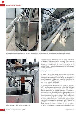 TECNOLOGIA DEL HORMIG%u00d3N38 PHI %u2013 Planta de Hormig%u00f3n Internacional %u2013 6 | 2025 www.cpi-worldwide.comdragalina tambi%u00e9n obtienen buenos resultados en t%u00e9rminos de eficiencia energ%u00e9tica, ya que requieren menos energ%u00eda que muchos otros sistemas de transporte. Todas estas caracter%u00edsticas pueden hacer de los sistemas con dragalina una soluci%u00f3n fiable y econ%u00f3mica para plantas de hormig%u00f3n peque%u00f1as y medianas.Tecnolog%u00eda de dosificaci%u00f3n precisaLa instalaci%u00f3n tambi%u00e9n cuenta con un amplio equipamiento en el %u00e1mbito de la tecnolog%u00eda de pesaje: adem%u00e1s de un dispositivo de pesaje de %u00e1ridos y una b%u00e1scula de conglomerantes de 1500 kg, se integraron en el sistema una b%u00e1scula de agua (positiva de 500 kg) y una b%u00e1scula de aditivos con cuatro c%u00e1maras (15/15/15/30 litros).La tecnolog%u00eda de dosificaci%u00f3n de Teka se adapta con precisi%u00f3n a los requisitos de la producci%u00f3n moderna de hormig%u00f3n y se integra a la perfecci%u00f3n en las instalaciones mezcladoras. Permite la alimentaci%u00f3n precisa de aditivos, pigmentos colorantes, f%u00edllers, as%u00ed como componentes l%u00edquidos y en polvo directamente en el proceso de mezcla. Se utilizan potentes bombas o transportadores de tornillo sin fin en combinaci%u00f3n con celdas de pesaje de alta resoluci%u00f3n y sensores de caudal.El control se lleva a cabo con un controlador l%u00f3gico programable (PLC) integrado, que asegura una gran precisi%u00f3n y repetibilidad del proceso de dosificaci%u00f3n. El sistema cerrado tambi%u00e9n asegura un funcionamiento con baja generaci%u00f3n de polvo, minimizando los trabajos de limpieza y manteniLa instalaci%u00f3n mezcladora Mixomat THZ 3000 est%u00e1 equipada con una moderna tecnolog%u00eda de dosificaci%u00f3n y seguridad.Sensor OLAS de Werne & Thiel sensortechnic