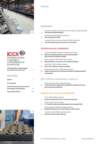 CONTENIDONOVEDADESDe inventor autodidacta a un fabricante l%u00edder en tecnolog%u00eda de hormig%u00f3n pretensado10 100 a%u00f1os de Paul MaschinenfabrikInternational Prestressed Hollowcore Association14 Nuevo presidente de la IPHALa integraci%u00f3n marca una expansi%u00f3n fundamental hacia Latinoam%u00e9rica16 Lintec & Linnhoff incorpora a Lintec-Ixon en su red mundialTECNOLOGIA DEL HORMIGONEnsayos de durabilidad de elementos prefabricados de hormig%u00f3n18 Aplicaci%u00f3n combinada de diversos ensayos de permeabilidad para el control de calidad del hormig%u00f3nKraft Curing Systems GmbH, 49699 Lindern, Alemania26 Madurez predictiva: una nueva era en el curado del hormig%u00f3nMapei GmbH, 63762 Gro%u00dfostheim, Alemania31 Nuevo servicio: DAP para mezclas de hormig%u00f3nTeka Maschinenbau GmbH, 67480 Edenkoben, Alemania34 Amplia modernizaci%u00f3n de la instalaci%u00f3n mezcladora de Heidelberg Materials en AhrensfeldeProgress 3D Concrete Printing, 39042 Brixen, Italia42 La impresi%u00f3n 3D de hormig%u00f3n brinda posibilidades completamente nuevaspara la construcci%u00f3n prefabricadaPRODUCTOS Y LOSAS DE HORMIGONPeri SE, 89264 Wei%u00dfenhorn, Alemania 46 Bandeja de producci%u00f3n Peri Pave: caracter%u00edsticas bajo la lupaAbierto el registro online de visitantes50 13.%u00aa Conferencia Internacional sobre Adoquines de Hormig%u00f3n (ICCBP)Hess Group GmbH, 57299 Burbach-Wahlbach, Alemania54 Micheletto Pavimentazioni: de ra%u00edces familiares a ideas de futuroKobra Formen GmbH, 08485 Lengenfeld, Alemania60 Dar forma al ma%u00f1ana desde el presentePHI %u2013 Planta de Hormig%u00f3n Internacional %u2013 6 | 2025 www.cpi-worldwide.com5426ICCX T%u00fcrkiye 2026 %u2013 Evento inaugural con ponencias clave de alto nivel 8SECCIONESEditorial 3Pie de imprenta 7Eventos internacionales para la industria del hormig%u00f3n y los prefabricados 14Empresas Anunciadores 129INTERNATIONAL CONCRETECONFERENCE & EXHIBITION