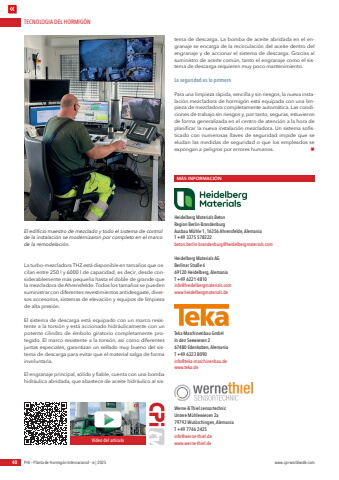 TECNOLOGIA DEL HORMIG%u00d3N40 PHI %u2013 Planta de Hormig%u00f3n Internacional %u2013 6 | 2025 www.cpi-worldwide.comLa turbo-mezcladora THZ est%u00e1 disponible en tama%u00f1os que oscilan entre 250 l y 6000 l de capacidad, es decir, desde considerablemente m%u00e1s peque%u00f1a hasta el doble de grande que la mezcladora de Ahrensfelde. Todos los tama%u00f1os se pueden suministrar con diferentes revestimientos antidesgaste, diversos accesorios, sistemas de elevaci%u00f3n y equipos de limpieza de alta presi%u00f3n.El sistema de descarga est%u00e1 equipado con un marco resistente a la torsi%u00f3n y est%u00e1 accionado hidr%u00e1ulicamente con un potente cilindro de %u00e9mbolo giratorio completamente protegido. El marco resistente a la torsi%u00f3n, as%u00ed como diferentes juntas especiales, garantizan un sellado muy bueno del sistema de descarga para evitar que el material salga de forma involuntaria.El engranaje principal, s%u00f3lido y fiable, cuenta con una bomba hidr%u00e1ulica abridada, que abastece de aceite hidr%u00e1ulico al sistema de descarga. La bomba de aceite abridada en el engranaje se encarga de la recirculaci%u00f3n del aceite dentro del engranaje y de accionar el sistema de descarga. Gracias al suministro de aceite com%u00fan, tanto el engranaje como el sistema de descarga requieren muy poco mantenimiento.La seguridad es lo primeroPara una limpieza r%u00e1pida, sencilla y sin riesgos, la nueva instalaci%u00f3n mezcladora de hormig%u00f3n est%u00e1 equipada con una limpieza de mezcladora completamente autom%u00e1tica. Las condiciones de trabajo sin riesgos y, por tanto, seguras, estuvieron de forma generalizada en el centro de atenci%u00f3n a la hora de planificar la nueva instalaci%u00f3n mezcladora. Un sistema sofisticado con numerosas llaves de seguridad impide que se eludan las medidas de seguridad o que los empleados se expongan a peligros por errores humanos. nV%u00eddeo del art%u00edculoM%u00c1S INFORMACI%u00d3NHeidelberg Materials Beton Region Berlin-BrandenburgAusbau M%u00fchle 1, 16356 Ahrensfelde, AlemaniaT +49 3375 578222beton.berlin-brandenburg@heidelbergmaterials.comHeidelberg Materials AGBerliner Stra%u00dfe 669120 Heidelberg, AlemaniaT +49 6221 4810info@heidelbergmaterials.com www.heidelbergmaterials.deTeka Maschinenbau GmbH In den Seewiesen 267480 Edenkoben, Alemania T +49 6323 8090 info@teka-maschinenbau.de www.teka.deWerne & Thiel sensortechnic Untere M%u00fchlewiesen 2a 79793 Wut%u00f6schingen, Alemania T +49 7746 2425 info@werne-thiel.de www.werne-thiel.deEl edificio maestro de mezclado y todo el sistema de control de la instalaci%u00f3n se modernizaron por completo en el marco de la remodelaci%u00f3n.