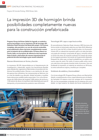 42 PHI %u2013 Planta de Hormig%u00f3n Internacional %u2013 6 | 2025 www.cpi-worldwide.comProgress Group de Brixen (Italia) ha logrado un aut%u00e9ntico avance tecnol%u00f3gico con su impresora 3D de hormig%u00f3n SPI (Selective Paste Intrusion) de desarrollo propio. Con formas complejas, alta precisi%u00f3n y un uso de recursos sostenible, el procedimiento ofrece opciones completamente nuevas para la industria de los prefabricados. El Pareus Resort en Caorle, Italia, es el proyecto de referencia m%u00e1s importante hasta la fecha y demuestra de manera impresionante el potencial de esta tecnolog%u00eda a gran escala industrial.Nuevas dimensiones en forma y funci%u00f3nLa impresora 3D SPI, desarrollada por el departamento de investigaci%u00f3n y desarrollo, aporta una herramienta flexible para arquitectos, ingenieros y fabricantes a la producci%u00f3n tradicional de prefabricados. Gracias a una resoluci%u00f3n de capa de apenas tres mil%u00edmetros, los componentes se fabrican con un nivel de detalle muy elevado: desde fachadas y muebles hasta elementos prefabricados especiales. Con unas dimensiones de 5,00 metros de longitud, 2,80 metros de anchura y 1,50 metros de altura, la impresora est%u00e1 dise%u00f1ada para que el transporte y el procesamiento posterior sean eficientes.Tecnolog%u00eda SPI: capa a capa hacia arribaEl procedimiento Selective Paste Intrusion (SPI) funciona de forma similar al sinterizado selectivo por l%u00e1ser (SLS). Mientras que en el caso de SLS un l%u00e1ser funde el polvo, en el procedimiento SPI un cabezal de impresi%u00f3n aplica con alta precisi%u00f3n una pasta de cemento compuesta de agua y cemento sobre un lecho de arena. El cemento endurece la mezcla de arena en los lugares previstos, formando as%u00ed la geometr%u00eda deseada. Despu%u00e9s de cada capa, se baja la plataforma y se aplica una nueva capa de arena. Por tanto, la arena suelta act%u00faa como una estructura de soporte durante todo el proceso. Una vez finalizada la impresi%u00f3n, el material se endurece en 24 horas, la arena sobrante se aspira y reutiliza por completo.Simbiosis de est%u00e9tica y funcionalidadCon la tecnolog%u00eda SPI, Progress Group ofrece una libertad de dise%u00f1o completamente nueva, especialmente para el dise%u00f1o de fachadas. El sistema a%u00fana las ventajas de la impresi%u00f3n 3D con las propiedades probadas de los sistemas de muro doble. La capa exterior se dise%u00f1a de forma individual meLa impresi%u00f3n 3D de hormig%u00f3n brinda posibilidades completamente nuevas para la construcci%u00f3n prefabricadaProgress 3D Concrete Printing, 39042 Brixen, ItaliaEl lecho de arena de la impresora 3D de hormig%u00f3n act%u00faa como base para la producci%u00f3n de diversas formas y elementos.