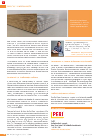 PRODUCTOS Y LOSAS DE HORMIG%u00d3N48 PHI %u2013 Planta de Hormig%u00f3n Internacional %u2013 6 | 2025 www.cpi-worldwide.comPave tambi%u00e9n destaca por sus requisitos de mantenimiento m%u00e1s bajos, lo que reduce el riesgo de tiempos de parada largos y, por tanto, permite ahorrar tiempo y costes. Se evitan los problemas habituales del proceso de producci%u00f3n, como formaci%u00f3n de grietas, deformaciones, hinchamientos o atascos en el circuito de circulaci%u00f3n. Si bien los costes secundarios derivados de estos problemas frecuentemente no se tienen en cuenta en las decisiones de inversi%u00f3n, con el paso del tiempo cobran una importancia econ%u00f3mica muy relevante. Con el servicio ReLife, Peri ofrece adem%u00e1s la posibilidad de renovar el recubrimiento de bandejas usadas, prolongando significativamente su ciclo de vida. Martin Manz considera este servicio como una respuesta coherente a la cuesti%u00f3n de la sostenibilidad de Peri Pave: %u00abNuestro producto merece una segunda vida, un beneficio absoluto tanto desde el punto de vista ecol%u00f3gico como econ%u00f3mico%u00bb. Caracter%u00edstica 5: Una bandeja con futuro El desarrollo de Peri Pave se basa en un profundo conocimiento tanto del procesamiento de la madera como de la fabricaci%u00f3n de productos de hormig%u00f3n. Esta combinaci%u00f3n ha dado como resultado un producto que ha demostrado su eficacia en las duras condiciones del d%u00eda a d%u00eda de la producci%u00f3n en todo el mundo. Tambi%u00e9n en el futuro, Peri apostar%u00e1 por la calidad, la sostenibilidad y la innovaci%u00f3n, con el objetivo de consolidar a%u00fan m%u00e1s la presencia de Peri Pave en el mercado. %u00abPeri Pave es el resultado de d%u00e9cadas de experiencia y de un perfeccionamiento constante del producto. La satisfacci%u00f3n y fidelidad de nuestros clientes nos motivan a seguir mejorando cada d%u00eda%u00bb, afirma Kathrin Wunder, corresponsable de Peri Pave desde 2005. Para que la historia de %u00e9xito de Peri Pave contin%u00fae en el futuro, Peri apuesta por una estrategia comercial a%u00fan m%u00e1s amplia. La apertura a nuevos mercados permitir%u00e1 aprovechar potenciales hasta ahora inexplorados y, al mismo tiempo, centrarse a%u00fan m%u00e1s en el valor a%u00f1adido que ofrece Peri Pave. Martin Manz lo resume as%u00ed: %u00abPodemos y queremos llegar m%u00e1s lejos. Peri Pave cumple con los m%u00e1s altos requisitos en cuanto a calidad, rentabilidad y sostenibilidad. Nuestro objetivo es hacer que los %u00e9xitos y las ventajas que aporta lleguen a un n%u00famero a%u00fan mayor de clientes%u00bb. Caracter%u00edstica 6: Cercan%u00eda al cliente en todo el mundo Peri apuesta cada vez m%u00e1s por socios locales con experiencia en el sector para su desarrollo en el mercado global. Gracias al contacto directo con expertos locales, Peri Pave pretende abrir progresivamente nuevos mercados, responder de forma espec%u00edfica a los cambios que se produzcan en cada uno de ellos y, de esta forma, hacer que la bandeja y sus ventajas sean accesibles a un mayor n%u00famero de clientes. Esto crea una relaci%u00f3n especialmente estrecha con el cliente. %u00abInvertimos en cercan%u00eda y visibilidad: Con un enfoque claro en las necesidades de nuestros clientes y el respaldo de nuevos socios comerciales con experiencia en el sector, generamos cercan%u00eda, confianza y un valor a%u00f1adido real%u00bb, destaca Martin Manz. Una historia de %u00e9xito con futuro Con Peri Pave, la empresa no solo mira hacia atr%u00e1s tras 25 a%u00f1os de %u00e9xitos, sino sobre todo hacia adelante. La calidad, la sostenibilidad y la fuerza innovadora seguir%u00e1n siendo en el futuro los pilares fundamentales de este producto. nM%u00c1S INFORMACI%u00d3NPeri SE Encofrado Andamio Ingenier%u00eda Rudolf-Diesel-Stra%u00dfe 19, 89264 Wei%u00dfenhorn, Alemania T +49 7309 9500 info@peri.com , www.peri.com/pave%u00abPodemos y queremos llegar m%u00e1s lejos. Nuestro objetivo es hacer que los %u00e9xitos y las ventajas del producto lleguen a un n%u00famero a%u00fan mayor de clientes%u00bb. Martin Manz, Resposnable de ventas y producto de Peri Pave Mucho m%u00e1s que madera contrachapada: la estructura orientada a ofrecer capacidad portante de Peri Pave