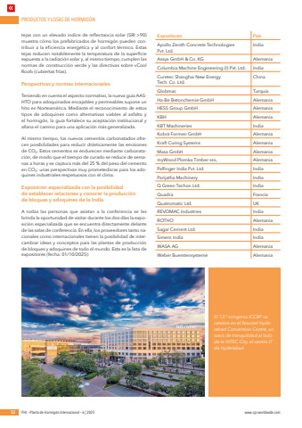 PRODUCTOS Y LOSAS DE HORMIG%u00d3N52 PHI %u2013 Planta de Hormig%u00f3n Internacional %u2013 6 | 2025 www.cpi-worldwide.comtejas con un elevado %u00edndice de reflectancia solar (SRI >90) muestra c%u00f3mo los prefabricados de hormig%u00f3n pueden contribuir a la eficiencia energ%u00e9tica y al confort t%u00e9rmico. Estas tejas reducen notablemente la temperatura de la superficie expuesta a la radiaci%u00f3n solar y, al mismo tiempo, cumplen las normas de construcci%u00f3n verde y las directivas sobre %u00abCool Roof%u00bb (cubiertas fr%u00edas).Perspectivas y normas internacionalesTeniendo en cuenta el aspecto normativo, la nueva gu%u00eda AASHTO para adoquinados encajables y permeables supone un hito en Norteam%u00e9rica. Mediante el reconocimiento de estos tipos de adoquines como alternativas viables al asfalto y el hormig%u00f3n, la gu%u00eda fortalece su aceptaci%u00f3n institucional y allana el camino para una aplicaci%u00f3n m%u00e1s generalizada.Al mismo tiempo, los nuevos cementos carbonatados ofrecen posibilidades para reducir dr%u00e1sticamente las emisiones de CO2. Estos cementos se endurecen mediante carbonataci%u00f3n, de modo que el tiempo de curado se reduce de semanas a horas y se captura m%u00e1s del 25 % del peso del cemento en CO2: unas perspectivas muy prometedoras para los adoquines industriales respetuosos con el clima.Exposici%u00f3n especializada con la posibilidad de establecer relaciones y conocer la producci%u00f3n de bloques y adoquines de la IndiaA todas las personas que asistan a la conferencia se les brinda la oportunidad de visitar durante los dos d%u00edas la exposici%u00f3n especializada que se encuentra directamente delante de las salas de conferencia. En ella, los proveedores tanto nacionales como internacionales tienen la posibilidad de intercambiar ideas y conceptos para las plantas de producci%u00f3n de bloques y adoquines de todo el mundo. Esta es la lista de expositores (fecha: 01/10/2025):Expositores Pa%u00edsApollo Zenith Concrete Technologies Pvt. Ltd.IndiaAssyx GmbH & Co. KG AlemaniaColumbia Machine Engineering (I) Pvt. Ltd. IndiaCuretec Shanghai New Energy Tech. Co. Ltd.ChinaGlobmac Turqu%u00edaHa-Be Betonchemie GmbH AlemaniaHESS Group GmbH AlemaniaKBH AlemaniaKBT Machineries IndiaKobra Formen GmbH AlemaniaKraft Curing Systems AlemaniaMasa GmbH AlemaniamyWood Plomka Timber sro, AlemaniaPalfinger India Pvt. Ltd. IndiaParijatha Machinery IndiaQ Green Techon Ltd. IndiaQuadra FranciaQuatromatic Ltd. UKREVOMAC Industries IndiaROTHO AlemaniaSagar Cement Ltd. IndiaSimem India IndiaWASA AG AlemaniaWeber Buerstensysteme AlemaniaEl 13.%u00ba congreso ICCBP se celebra en el Novotel Hyderabad Convention Centre, un oasis de tranquilidad al lado de la HITEC City, el centro IT de Hyderabad