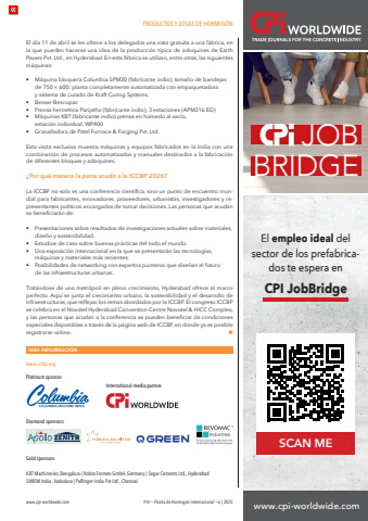 PRODUCTOS Y LOSAS DE HORMIG%u00d3Nwww.cpi-worldwide.com PHI %u2013 Planta de Hormig%u00f3n Internacional %u2013 6 | 2025M%u00c1S INFORMACI%u00d3Nwww.iccbp.orgPlatinum sponsorDiamond sponsorsGold sponsorsKBT Machineries, Bengaluru | Kobra Formen GmbH, Germany | Sagar Cements Ltd., Hyderabad SIMEM India , Vadodara | Palfinger India Pvt Ltd., ChennaiInternational media partnerEl d%u00eda 11 de abril se les ofrece a los delegados una vista gratuita a una f%u00e1brica, en la que pueden hacerse una idea de la producci%u00f3n t%u00edpica de adoquines de Earth Pavers Pvt. Ltd., en Hyderabad. En esta f%u00e1brica se utilizan, entre otras, las siguientes m%u00e1quinas:%u2022 M%u00e1quina bloquera Columbia SPM30 (fabricante indio), tama%u00f1o de bandejas de 750 %u00d7 600: planta completamente automatizada con empaquetadora y sistema de curado de Kraft Curing Systems.%u2022 Besser-Bescopac%u2022 Prensa herm%u00e9tica Parijatha (fabricante indio), 3 estaciones (APM316 ED)%u2022 M%u00e1quinas KBT (fabricante indio) prensa en h%u00famedo al vac%u00edo, estaci%u00f3n individual, WP400%u2022 Granalladora de Patel Furnace & Forging Pvt. Ltd.Esta visita exclusiva muestra m%u00e1quinas y equipos fabricados en la India con una combinaci%u00f3n de procesos automatizados y manuales destinados a la fabricaci%u00f3n de diferentes bloques y adoquines.%u00bfPor qu%u00e9 merece la pena acudir a la ICCBP 2026?La ICCBP no solo es una conferencia cient%u00edfica, sino un punto de encuentro mundial para fabricantes, innovadores, proveedores, urbanistas, investigadores y representantes pol%u00edticos encargados de tomar decisiones. Las personas que acudan se beneficiar%u00e1n de:%u2022 Presentaciones sobre resultados de investigaciones actuales sobre materiales, dise%u00f1o y sostenibilidad.%u2022 Estudios de caso sobre buenas pr%u00e1cticas del todo el mundo.%u2022 Una exposici%u00f3n internacional en la que se presentar%u00e1n las tecnolog%u00edas, m%u00e1quinas y materiales m%u00e1s recientes.%u2022 Posibilidades de networking con expertos punteros que dise%u00f1an el futuro de las infraestructuras urbanas.Trat%u00e1ndose de una metr%u00f3poli en pleno crecimiento, Hyderabad ofrece el marco perfecto. Aqu%u00ed se junta el crecimiento urbano, la sostenibilidad y el desarrollo de infraestructuras, que reflejan los remas abordados por la ICCBP. El congreso ICCBP se celebra en el Novotel Hyderabad Convention Centre Novotel & HICC Complex, y las personas que acudan a la conferencia se pueden beneficiar de condiciones especiales disponibles a trav%u00e9s de la p%u00e1gina web de ICCBP, en donde ya es posible registrarse online. nwww.cpi-worldwide.comSCAN MECPI JobBridgeEl empleo ideal del sector de los prefabrica - dos te espera enJOBBRIDGE