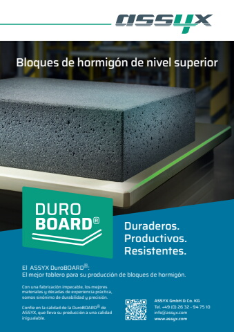 Duraderos.Productivos.Resistentes.ASSYX GmbH & Co. KGTel. +49 (0) 26 32 - 94 75 10info@assyx.comwww.assyx.comCon una fabricaci%u00f3n impecable, los mejores materiales y d%u00e9cadas de experiencia pr%u00e1ctica, somos sin%u00f3nimo de durabilidad y precisi%u00f3n.Conf%u00ede en la calidad de la DuroBOARD%u00ae de ASSYX, que lleva su producci%u00f3n a una calidad inigualable.El ASSYX DuroBOARD%u00ae: El mejor tablero para su producci%u00f3n de bloques de hormig%u00f3n.Bloques de hormig%u00f3n de nivel superior