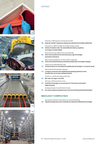 PHI %u2013 Planta de Hormig%u00f3n Internacional %u2013 6 | 2025 www.cpi-worldwide.comCONTENIDOOlmet Italy, 31040 Signoressa di Trevignano (TV), Italia100 Expansi%u00f3n mundial: maquinaria y equipos para elementos de hormig%u00f3n prefabricadoPrensoland S.A., 08592 Sant Mart%u00ed de Centelles, Barcelona, Espa%u00f1a104 Sistema de alambres vistos: Una soluci%u00f3nlibre de silicosis y respetuosa con el agua y el medio ambieteBianchi Precast Group, 43045 Fornovo di Taro (PR), Italia106 Nueva l%u00ednea de producci%u00f3n de autorreacci%u00f3n para vigas de hormig%u00f3n pretensado en DinamarcaWasa Compound GmbH & Co. KG, 98617 Neubrunn, Alemania108%u0009 T%u00e9cnica de encofrado flexible para elementos prefabricados de hormig%u00f3n complejosProgress Group, 39042 Bresanona, Italia112 Innovaci%u00f3n pionera en la producci%u00f3n de prefabricados de hormig%u00f3n en el oeste de Canad%u00e1Ratec GmbH, 68766 Hockenheim, Alemania 116 La empresa constructora Glass GmbH Bauunternehmung moderniza la l%u00ednea de producci%u00f3n con un nuevo encofrado en bater%u00eda Schnell S.p.a., 61036 Colli al Metauro (PU), Italia120 M%u00e1s veloz, m%u00e1s segura, m%u00e1s s%u00f3lidaCBE Group, 37550 Saint Avertin, Francia122 Encofrados de hormig%u00f3n con una precisi%u00f3n de 1/10 mm para onstrucciones fiables de t%u00fanelesNordimpianti System Srl, 66100 Chieti (CH), Italia126 Dos nuevas m%u00e1quinas autom%u00e1ticas para Cross Concrete Flooring Ltd (Irlanda del Norte)MEZCLADO Y COMPACTADOAparcamiento subterr%u00e1neo de seis plantas en el t%u00fanel de K%u00fcchelberg130 Espectacular garaje tipo caverna construido con elementos prefabricados de hormig%u00f3n108122130126