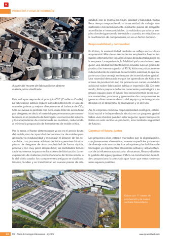 PRODUCTOS Y LOSAS DE HORMIG%u00d3N64 PHI %u2013 Planta de Hormig%u00f3n Internacional %u2013 6 | 2025 www.cpi-worldwide.comEste enfoque responde al principio C2C (Cradle to Cradle). La fabricaci%u00f3n aditiva reduce considerablemente el uso de materias primas y mejora directamente el balance de CO2 S%u00f3lo se eval%u00faa la p%u00e9rdida real de la masa total de acero total por desgaste, es decir, el material que permanece permanentemente en el producto de hormig%u00f3n. Los marcos del sistema y los adaptadores de contramolde se reutilizan, reduciendo al m%u00ednimo la proporci%u00f3n de herramienta de molde cr%u00edtica.Por lo tanto, el factor determinante ya no es el precio bruto del molde, sino la capacidad del constructor de moldes para gestionar la modularidad y minimizar el alcance de los recambios. Los procesos aditivos de Kobra permiten fabricar piezas de desgaste de alta complejidad de forma r%u00e1pida, precisa y con muy poco desperdicio; las cantidades tienen cada vez menos impacto en los costes de fabricaci%u00f3n. La recuperaci%u00f3n de materias primas funciona de forma similar a la del vidrio usado: los componentes antiguos se clasifican, trituran, funden y se transforman en nuevas piezas de alta calidad, con la misma precisi%u00f3n, calidad y fiabilidad. Kobra lleva tiempo respondiendo a la necesidad de trabajar con materiales monocomponente mediante piezas de desgaste atornilladas e intercambiables. La soldadura ya solo se emplea donde sigue siendo inevitable o cuando, en relaci%u00f3n con la reutilizaci%u00f3n de componentes, no es un factor decisivo.Responsabilidad y continuidadEn Kobra, la sostenibilidad tambi%u00e9n se refleja en la cultura empresarial. M%u00e1s de un tercio de los empleados fueron formados internamente y muchos llevan d%u00e9cadas trabajando en la empresa. La experiencia, la fidelidad y el conocimiento aseguran una calidad constantemente elevada. Con un grado de producci%u00f3n interna superior al 95 %, Kobra es pr%u00e1cticamente independiente de cadenas de suministro externas, lo que supone una clara ventaja en tiempos de incertidumbre global.Una novedad destacada es que los aprendices de Kobra en el %u00e1rea de producci%u00f3n son los primeros en cursar un m%u00f3dulo adicional sobre fabricaci%u00f3n aditiva e impresi%u00f3n 3D. De este modo, Kobra prepara de forma consciente y estrat%u00e9gica a su propio equipo para el futuro: los conocimientos sobre nuevos materiales, procesos y geometr%u00edas de componentes se generan directamente dentro del equipo y se integran sin demora en el desarrollo, la producci%u00f3n y el servicio.As%u00ed, la empresa combina responsabilidad ecol%u00f3gica, estabilidad social e independencia t%u00e9cnica en un paquete global fiable. %u00abLos clientes pueden estar seguros: quien trabaja con Kobra no solo recibe un producto, sino tambi%u00e9n seguridad de futuro%u00bb.Construir el futuro, juntosLos pr%u00f3ximos a%u00f1os estar%u00e1n marcados por la digitalizaci%u00f3n, conglomerantes alternativos, nuevas superficies y sistemas de drenaje m%u00e1s avanzados. Los adoquines y las baldosas de hormig%u00f3n ya representan elementos activos y arquitect%u00f3nicos de la infraestructura urbana: almacenan, filtran y dise%u00f1an la gesti%u00f3n del agua y gu%u00edan el tr%u00e1fico. La construcci%u00f3n de moldes proporciona la precisi%u00f3n que hace que estos sistemas sean siquiera posibles.A partir del recorte de fabricaci%u00f3n se obtiene materia prima clasificadaKobra con 11 naves de producci%u00f3n y la nueva cochera fotovoltaica