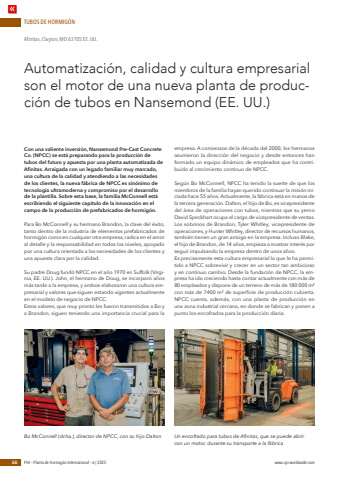 TUBOS DE HORMIG%u00d3N66 PHI %u2013 Planta de Hormig%u00f3n Internacional %u2013 6 | 2025 www.cpi-worldwide.comCon una valiente inversi%u00f3n, Nansemond Pre-Cast Concrete Co. (NPCC) se est%u00e1 preparando para la producci%u00f3n de tubos del futuro y apuesta por una planta automatizada de Afinitas. Arraigada con un legado familiar muy marcado, una cultura de la calidad y atendiendo a las necesidades de los clientes, la nueva f%u00e1brica de NPCC es sin%u00f3nimo de tecnolog%u00eda ultramoderna y compromiso por el desarrollo de la plantilla. Sobre esta base, la familia McConnell est%u00e1 escribiendo el siguiente cap%u00edtulo de la innovaci%u00f3n en el campo de la producci%u00f3n de prefabricados de hormig%u00f3n.Para Bo McConnell y su hermano Brandon, la clave del %u00e9xito, tanto dentro de la industria de elementos prefabricados de hormig%u00f3n como en cualquier otra empresa, radica en el amor al detalle y la responsabilidad en todos los niveles, apoyado por una cultura orientada a las necesidades de los clientes y una apuesta clara por la calidad.Su padre Doug fund%u00f3 NPCC en el a%u00f1o 1970 en Suffolk (Virginia, EE. UU.). John, el hermano de Doug, se incorpor%u00f3 a%u00f1os m%u00e1s tarde a la empresa, y ambos elaboraron una cultura empresarial y valores que siguen estando vigentes actualmente en el modelo de negocio de NPCC.Estos valores, que muy pronto les fueron transmitidos a Bo y a Brandon, siguen teniendo una importancia crucial para la empresa. A comienzos de la d%u00e9cada del 2000, los hermanos asumieron la direcci%u00f3n del negocio y desde entonces han formado un equipo din%u00e1mico de empleados que ha contribuido al crecimiento continuo de NPCC.Seg%u00fan Bo McConnell, NPCC ha tenido la suerte de que los miembros de la familia hayan querido continuar la misi%u00f3n iniciada hace 55 a%u00f1os. Actualmente, la f%u00e1brica est%u00e1 en manos de la tercera generaci%u00f3n. Dalton, el hijo de Bo, es vicepresidente del %u00e1rea de operaciones con tubos, mientras que su yerno David Speckhart ocupa el cargo de vicepresidente de ventas. Los sobrinos de Brandon, Tyler Whitley, vicepresidente de operaciones, y Hunter Whitley, director de recursos humanos, tambi%u00e9n tienen un gran arraigo en la empresa. Incluso Blake, el hijo de Brandon, de 14 a%u00f1os, empieza a mostrar inter%u00e9s por seguir impulsando la empresa dentro de unos a%u00f1os.Es precisamente esta cultura empresarial la que le ha permitido a NPCC sobrevivir y crecer en un sector tan ambicioso y en continuo cambio. Desde la fundaci%u00f3n de NPCC, la empresa ha ido creciendo hasta contar actualmente con m%u00e1s de 80 empleados y dispone de un terreno de m%u00e1s de 180 000 m%u00b2 con m%u00e1s de 7400 m%u00b2 de superficie de producci%u00f3n cubierta. NPCC cuenta, adem%u00e1s, con una planta de producci%u00f3n en una zona industrial cercana, en donde se fabrican y ponen a punto los encofrados para la producci%u00f3n diaria.Automatizaci%u00f3n, calidad y cultura empresarial son el motor de una nueva planta de producci%u00f3n de tubos en Nansemond (EE. UU.)Afinitas, Clayton, MO 63105 EE. UU.Bo McConnell (dcha.), director de NPCC, con su hijo Dalton Un encofrado para tubos de Afinitas, que se puede abrir con un motor, durante su transporte a la f%u00e1brica