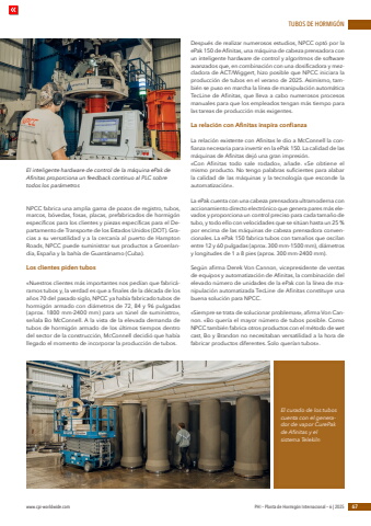 TUBOS DE HORMIG%u00d3Nwww.cpi-worldwide.com PHI %u2013 Planta de Hormig%u00f3n Internacional %u2013 6 | 2025 67NPCC fabrica una amplia gama de pozos de registro, tubos, marcos, b%u00f3vedas, fosas, placas, prefabricados de hormig%u00f3n espec%u00edficos para los clientes y piezas espec%u00edficas para el Departamento de Transporte de los Estados Unidos (DOT). Gracias a su versatilidad y a la cercan%u00eda al puerto de Hampton Roads, NPCC puede suministrar sus productos a Groenlandia, Espa%u00f1a y la bah%u00eda de Guant%u00e1namo (Cuba).Los clientes piden tubos%u00abNuestros clientes m%u00e1s importantes nos ped%u00edan que fabric%u00e1ramos tubos y, la verdad es que a finales de la d%u00e9cada de los a%u00f1os 70 del pasado siglo, NPCC ya hab%u00eda fabricado tubos de hormig%u00f3n armado con di%u00e1metros de 72, 84 y 96 pulgadas (aprox. 1800 mm-2400 mm) para un t%u00fanel de suministro%u00bb, se%u00f1ala Bo McConnell. A la vista de la elevada demanda de tubos de hormig%u00f3n armado de los %u00faltimos tiempos dentro del sector de la construcci%u00f3n, McConnell decidi%u00f3 que hab%u00eda llegado el momento de incorporar la producci%u00f3n de tubos.Despu%u00e9s de realizar numerosos estudios, NPCC opt%u00f3 por la ePak 150 de Afinitas, una m%u00e1quina de cabeza prensadora con un inteligente hardware de control y algoritmos de software avanzados que, en combinaci%u00f3n con una dosificadora y mezcladora de ACT/Wiggert, hizo posible que NPCC iniciara la producci%u00f3n de tubos en el verano de 2025. Asimismo, tambi%u00e9n se puso en marcha la l%u00ednea de manipulaci%u00f3n autom%u00e1tica TecLine de Afinitas, que lleva a cabo numerosos procesos manuales para que los empleados tengan m%u00e1s tiempo para las tareas de producci%u00f3n m%u00e1s exigentes.La relaci%u00f3n con Afinitas inspira confianzaLa relaci%u00f3n existente con Afinitas le dio a McConnell la confianza necesaria para invertir en la ePak 150. La calidad de las m%u00e1quinas de Afinitas dej%u00f3 una gran impresi%u00f3n.%u00abCon Afinitas todo sale rodado%u00bb, a%u00f1ade. %u00abSe obtiene el mismo producto. No tengo palabras suficientes para alabar la calidad de las m%u00e1quinas y la tecnolog%u00eda que esconde la automatizaci%u00f3n%u00bb.La ePak cuenta con una cabeza prensadora ultramoderna con accionamiento directo electr%u00f3nico que genera pares m%u00e1s elevados y proporciona un control preciso para cada tama%u00f1o de tubo, y todo ello con velocidades que se sit%u00faan hasta un 25 % por encima de las m%u00e1quinas de cabeza prensadora convencionales. La ePak 150 fabrica tubos con tama%u00f1os que oscilan entre 12 y 60 pulgadas (aprox. 300 mm-1500 mm), di%u00e1metros y longitudes de 1 a 8 pies (aprox. 300 mm-2400 mm).Seg%u00fan afirma Derek Von Cannon, vicepresidente de ventas de equipos y automatizaci%u00f3n de Afinitas, la combinaci%u00f3n del elevado n%u00famero de unidades de la ePak con la l%u00ednea de manipulaci%u00f3n automatizada TecLine de Afinitas constituye una buena soluci%u00f3n para NPCC.%u00abSiempre se trata de solucionar problemas%u00bb, afirma Von Cannon. %u00abBo quer%u00eda el mayor n%u00famero de tubos posible. Como NPCC tambi%u00e9n fabrica otros productos con el m%u00e9todo de wet cast, Bo y Brandon no necesitaban versatilidad a la hora de fabricar productos diferentes. Solo quer%u00edan tubos%u00bb.El inteligente hardware de control de la m%u00e1quina ePak de Afinitas proporciona un feedback continuo al PLC sobre todos los par%u00e1metrosEl curado de los tubos cuenta con el generador de vapor CurePak de Afinitas y el sistema Telekiln