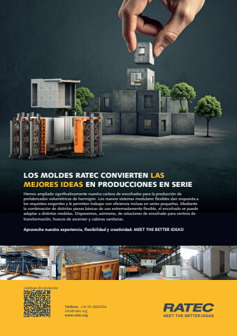 Tel%u00e9fono +34 93 4683036info@ratec.orgwww.ratec.orgCat%u00e1logo de productosHemos ampliado significativamente nuestra cartera de encofrados para la producci%u00f3n de prefabricados volum%u00e9tricos de hormig%u00f3n. Los nuevos sistemas modulares flexibles dan respuesta a los requisitos exigentes y le permiten trabajar con eficiencia incluso en series peque%u00f1as. Mediante la combinaci%u00f3n de distintas piezas b%u00e1sicas de uso extremadamente flexible, el encofrado se puede adaptar a distintas medidas. Disponemos, asimismo, de soluciones de encofrado para centros de transformaci%u00f3n, huecos de ascensor y cabinas sanitarias. Aproveche nuestra experiencia, flexibilidad y creatividad: MEET THE BETTER IDEAS!LOS MOLDES RATEC CONVIERTEN LAS MEJORES IDEAS EN PRODUCCIONES EN SERIE