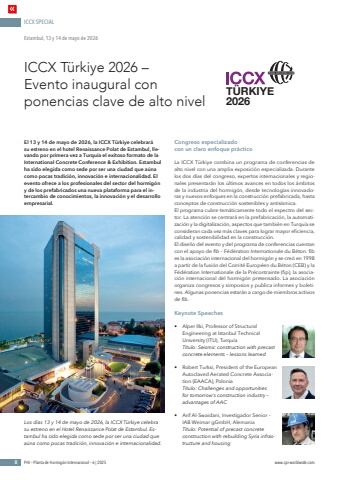 ICCX SPECIAL8 PHI %u2013 Planta de Hormig%u00f3n Internacional %u2013 6 | 2025 www.cpi-worldwide.comEl 13 y 14 de mayo de 2026, la ICCX T%u00fcrkiye celebrar%u00e1 su estreno en el hotel Renaissance Polat de Estambul, llevando por primera vez a Turqu%u00eda el exitoso formato de la International Concrete Conference & Exhibition. Estambul ha sido elegida como sede por ser una ciudad que a%u00fana como pocas tradici%u00f3n, innovaci%u00f3n e internacionalidad. El evento ofrece a los profesionales del sector del hormig%u00f3n y de los prefabricados una nueva plataforma para el intercambio de conocimientos, la innovaci%u00f3n y el desarrollo empresarial.Congreso especializado con un claro enfoque pr%u00e1cticoLa ICCX T%u00fcrkiye combina un programa de conferencias de alto nivel con una amplia exposici%u00f3n especializada. Durante los dos d%u00edas del congreso, expertos internacionales y regionales presentar%u00e1n los %u00faltimos avances en todos los %u00e1mbitos de la industria del hormig%u00f3n, desde tecnolog%u00edas innovadoras y nuevos enfoques en la construcci%u00f3n prefabricada, hasta conceptos de construcci%u00f3n sostenibles y antis%u00edsmica.El programa cubre tem%u00e1ticamente todo el espectro del sector. La atenci%u00f3n se centrar%u00e1 en la prefabricaci%u00f3n, la automatizaci%u00f3n y la digitalizaci%u00f3n, aspectos que tambi%u00e9n en Turqu%u00eda se consideran cada vez m%u00e1s claves para lograr mayor eficiencia, calidad y sostenibilidad en la construcci%u00f3n. El dise%u00f1o del evento y del programa de conferencias cuentan con el apoyo de fib %u2013 F%u00e9d%u00e9ration Internationale du B%u00e9ton. fib es la asociaci%u00f3n internacional del hormig%u00f3n y se cre%u00f3 en 1998 a partir de la fusi%u00f3n del Comit%u00e9 Europ%u00e9en du B%u00e9ton (CEB) y la F%u00e9d%u00e9ration Internationale de la Pr%u00e9contrainte (fip), la asociaci%u00f3n internacional del hormig%u00f3n pretensado. La asociaci%u00f3n organiza congresos y simposios y publica informes y boletines. Algunas ponencias estar%u00e1n a cargo de miembros activos de fib.Keynote Speeches%u2022 Alper Ilki, Professor of Structural Engineering at Istanbul Technical University (ITU), Turqu%u00eda T%u00edtulo: Seismic construction with precast concrete elements %u2013 lessons learned%u2022 Robert Turksi, President of the European Autoclaved Aerated Concrete Association (EAACA), PoloniaT%u00edtulo: Challenges and opportunities for tomorrow%u2018s construction industry %u2013 advantages of AAC%u2022 Arif Al-Swaidani, Investigador Senior %u2013 IAB Weimar gGmbH, Alemania T%u00edtulo: Potential of precast concrete construction with rebuilding Syria infrastructure and housingICCX T%u00fcrkiye 2026 %u2013 Evento inaugural con ponencias clave de alto nivelEstambul, 13 y 14 de mayo de 2026T%u00dcRKIYE2026Los d%u00edas 13 y 14 de mayo de 2026, la ICCX T%u00fcrkiye celebra su estreno en el Hotel Renaissance Polat de Estambul. Estambul ha sido elegida como sede por ser una ciudad que a%u00fana como pocas tradici%u00f3n, innovaci%u00f3n e internacionalidad.