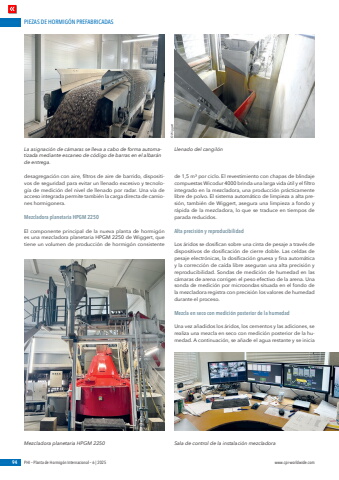 PIEZAS DE HORMIG%u00d3N PREFABRICADAS94 PHI %u2013 Planta de Hormig%u00f3n Internacional %u2013 6 | 2025 www.cpi-worldwide.comdesagregaci%u00f3n con aire, filtros de aire de barrido, dispositivos de seguridad para evitar un llenado excesivo y tecnolog%u00eda de medici%u00f3n del nivel de llenado por radar. Una v%u00eda de acceso integrada permite tambi%u00e9n la carga directa de camiones hormigonera.Mezcladora planetaria HPGM 2250El componente principal de la nueva planta de hormig%u00f3n es una mezcladora planetaria HPGM 2250 de Wiggert, que tiene un volumen de producci%u00f3n de hormig%u00f3n consistente de 1,5 m%u00b3 por ciclo. El revestimiento con chapas de blindaje compuestas Wicodur 4000 brinda una larga vida %u00fatil y el filtro integrado en la mezcladora, una producci%u00f3n pr%u00e1cticamente libre de polvo. El sistema autom%u00e1tico de limpieza a alta presi%u00f3n, tambi%u00e9n de Wiggert, asegura una limpieza a fondo y r%u00e1pida de la mezcladora, lo que se traduce en tiempos de parada reducidos.Alta precisi%u00f3n y reproducibilidadLos %u00e1ridos se dosifican sobre una cinta de pesaje a trav%u00e9s de dispositivos de dosificaci%u00f3n de cierre doble. Las celdas de pesaje electr%u00f3nicas, la dosificaci%u00f3n gruesa y fina autom%u00e1tica y la correcci%u00f3n de ca%u00edda libre aseguran una alta precisi%u00f3n y reproducibilidad. Sondas de medici%u00f3n de humedad en las c%u00e1maras de arena corrigen el peso efectivo de la arena. Una sonda de medici%u00f3n por microondas situada en el fondo de la mezcladora registra con precisi%u00f3n los valores de humedad durante el proceso.Mezcla en seco con medici%u00f3n posterior de la humedadUna vez a%u00f1adidos los %u00e1ridos, los cementos y las adiciones, se realiza una mezcla en seco con medici%u00f3n posterior de la humedad. A continuaci%u00f3n, se a%u00f1ade el agua restante y se inicia La asignaci%u00f3n de c%u00e1maras se lleva a cabo de forma automatizada mediante escaneo de c%u00f3digo de barras en el albar%u00e1n de entrega.Llenado del cangil%u00f3n%u00a9WiggertMezcladora planetaria HPGM 2250 Sala de control de la instalaci%u00f3n mezcladora