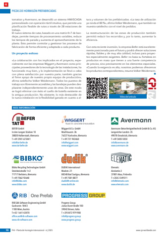 PIEZAS DE HORMIG%u00d3N PREFABRICADAS98 PHI %u2013 Planta de Hormig%u00f3n Internacional %u2013 6 | 2025 www.cpi-worldwide.comM%u00c1S INFORMACI%u00d3NBEFER GmbHIn den Langen St%u00fccken 1038820 Halberstadt, AlemaniaT +49 3941 672441info@tat-befer.dewww.tat-befer.deWiggert & Co. GmbH Wachhausstr. 3b76227 Karlsruhe, Alemania T +49 721 943460 info@wiggert.com www.wiggert.comAvermann Betonfertigteiltechnik GmbH & Co. KG Lengericher Landstr. 3549078 Osnabr%u00fcck, Alemania T +49 5405 5050 info@avermann.de www.avermann.deBibko Recycling Technologies GmbH Steinbeisstra%u00dfe 1+2 71717 Beilstein, Alemania T +49 7062 92640 info@bibko.com www.bibko.comDUDIK InternationalMackstr. 2188348 Bad Saulgau, AlemaniaT +49 7581 8877dudik@t-online.dewww.dudik.deElematic Airolantie 2 37801 Akaa, Finlandia T +358 3 549511info@elematic.comwww.elematic.comRIB SAA Software Engineering GmbH Gudrunstr. 184/31100 Wien, Austria T+43 1 641 42470 office.aut@rib-software.com www.rib-software.comProgress Group Julius-Durst-Stra%u00dfe 100 39042 Brixen, Italia T +39 0472 979 900 info@progress.group www.progress.groupV%u00eddeo del art%u00edculotomation y Avermann, se desarroll%u00f3 un sistema HMI/SCADA personalizado con operaci%u00f3n t%u00e1ctil intuitiva, que permite una planificaci%u00f3n flexible de rutas a trav%u00e9s de 28 estaciones de trabajo.El nuevo sistema de rutas, basado en una matriz 4%u00d77 de bandejas, permite tiempos de procesamiento variables, reduce los tiempos de parada y aumenta el aprovechamiento de la planta. Esto permite controlar y gestionar los procesos de fabricaci%u00f3n de forma eficiente y adaptada a cada producto.Un proyecto exitoso%u00abLa colaboraci%u00f3n con los implicados en el proyecto, especialmente con las empresas Wiggert y Avermann como principales proveedores de la tecnolog%u00eda de las instalaciones, ha funcionado muy bien, y la implementaci%u00f3n se llev%u00f3 a cabo con plena satisfacci%u00f3n por nuestra parte, tambi%u00e9n gracias al firme apoyo de nuestro propio equipo de producci%u00f3n%u00bb, afirma satisfecho Volker Weidemann. Todos los puestos de trabajo son libremente accesibles y las bandejas pueden desplazarse independientemente unas de otras. De este modo se logr%u00f3 eliminar con %u00e9xito el cuello de botella existente en la antigua producci%u00f3n. No obstante, lo m%u00e1s destacable de la nueva instalaci%u00f3n es la flexibilidad ganada en cuanto a altura y volumen de los prefabricados. %u00abLa tasa de utilizaci%u00f3n ya ronda el 80 %%u00bb, afirma Volker Weidemann, que tambi%u00e9n se muestra satisfecho con el nivel de pedidos.La reestructuraci%u00f3n de las zonas de producci%u00f3n tambi%u00e9n permiti%u00f3 reducir los recorridos y, por lo tanto, aumentar la eficiencia.Con esta reciente inversi%u00f3n, la empresa Befer est%u00e1 excelentemente posicionada para el futuro y podr%u00e1 ofrecer soluciones r%u00e1pidas, fiables y de muy alta calidad, incluso para proyectos especialmente exigentes. Befer no basa su fortaleza en productos en masa que tienen a una fuerte competencia de precios, sino precisamente en los elementos especiales. %u00abCuando la exigencia es alta, nosotros podemos ofrecemos los productos correspondientes%u00bb, resume Volker Weidemann.nRECYCLING TECHNOLOGIES