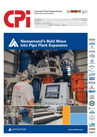 Concrete Plant InternationalIndian Sub Continent Edition 6 2025ICCX SPECIAL ICCX T%u00fcrkiye 2026 %u2013 Premiere event with exciting keynotes CONSTRUCTION PRINTING TECHNOLOGY 3D concrete printing offers entirely new possibilities in precast construction CONCRETE PRODUCTS & CAST STONE From Family Roots to Future Visions: Micheletto Pavimentazioni CONCRETE PIPES AND MANHOLES Automation, Quality, and Culture Drive Nansemond%u00b4s Bold Move into Pipe Plant Expansion PRECAST CONCRETE ELEMENTS New self-reacting production line for prestressed beams in Denmark Nansemond%u2019s Bold Move into Pipe Plant Expansionwww.afinitas.com