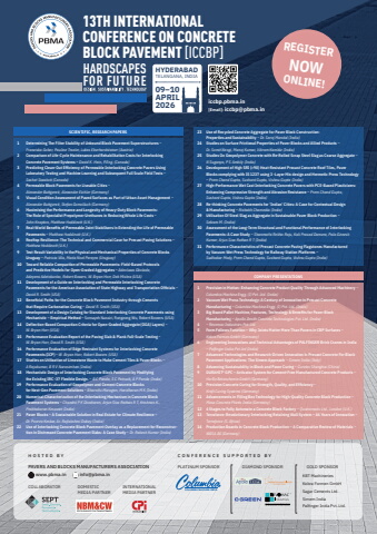 13TH INTERNATIONAL CONFERENCE ON CONCRETE BLOCK PAVEMENT [ICCBP]HARDSCAPESFOR FUTUREHYDERABADTELANGANA, INDIA09%u201310 APRIL2026 iccbp.pbma.in[Email]: iccbp@pbma.inHOSTED BYPAVERS AND BLOCKS MANUFACTURERS ASSOCIATIONwww.pbma.in info@pbma.in COLLABORATOR INTERNATIONALMEDIA PARTNERDOMESTICMEDIA PARTNERCONFERENCE SUPPORTED BYPLATINUM SPONSOR DIAMOND SPONSOR GOLD SPONSORSCIENTIFIC, RESEARCH PAPERS1 Determining The Filter Stability of Unbound Block Pavement Superstructures %u2013 Franziska Gober, Pauline Traxler, Lukas Eberhardsteiner (Austria)2 Comparison of Life-Cycle Maintenance and Rehabilitation Costs for Interlocking Concrete Pavement Systems %u2013 David K. Hein, P.Eng. (Canada)3 Predicting Clean-Out Effi ciency of Permeable Interlocking Concrete Pavers Using Laboratory Testing and Machine Learning and Subsequent Full Scale Field Tests %u2013 Sachet Siwakoti (Canada) 4 Permeable Block Pavements for Liveable Cities %u2013 Alexander Buttgereit, Alexander Eichler (Germany)5 Visual Condition Assessment of Paved Surfaces as Part of Urban Asset Management %u2013 Alexander Buttgereit, Stefan Gomolluch (Germany)6 Maximising the Performance and Longevity of Heavy-Duty Block Pavements: The Role of Specialist Prepolymer Urethanes in Reducing Whole Life Costs %u2013 John Knapton, Matthew Hoddinott (U.K.) 7 Real-World Benefi ts of Permeable Joint Stabilisers in Extending the Life of Permeable Pavements %u2013 Matthew Hoddinott (U.K.)8 Rooftop Resilience: The Technical and Commercial Case for Precast Paving Solutions %u2013 Matthew Hoddinott (U.K.)9 Test Result Variability in the Physical and Mechanical Properties of Concrete Blocks Uruguay %u2013 Patricia Vila, Mar%u00eda Noel Pereyra (Uruguay)10 Toward Reliable Compaction of Permeable Pavements: Field-Based Protocols and Predictive Models for Open-Graded Aggregates %u2013 Adeoluwa Gbolade, Adeyemi Adetokunbo, Robert Bowers, W. Bryan Horr, Deb Mishra (USA)11 Development of a Guide on Interlocking and Permeable Interlocking Concrete Pavements for the American Association of State Highway and Transportation Offi cials %u2013 David R. Smith (USA)12 Benefi cial Paths for the Concrete Block Pavement Industry through Cements that Require Carbonation Curing %u2013 David R. Smith (USA)13 Development of a Design Catalog for Standard Interlocking Concrete Pavements using Mechanistic %u2013 Empirical Method %u2013 Somayeh Nassiri, Rongzong Wu, Robert Bowers (USA)14 Deflection-Based Compaction Criteria for Open-Graded Aggregate (OGA) Layers) %u2013 W. Bryan Horr (USA)15 Performance Evaluation Report of the Paving Slab & Plank Full-Scale Testing %u2013 W. Bryan Horr, David R. Smith (USA)16 Performance Evaluation of Edge Restraint Systems for Interlocking Concrete Pavements (ICP) %u2013 W. Bryan Horr, Robert Bowers (USA)17 Studies on Utilization of Limestone Waste to Make Cement Tiles & Paver Blocks %u2013 A Rajakumar, B R V Narasimhan (India)18 Mechanistic Design of Interlocking Concrete Block Pavement by Modifying the Existing IRC -37 Flexible Design. %u2013 B C Panda, S C Patnaik, A P Panda (India)19 Performance Evaluation of Geopolymer and Cement Concrete Blocks for Next-Gen Pavement Solutions %u2013 Bharathi Murugan, Haridharan M K (India)20 Numerical Characterization of the Interlocking Mechanism in Concrete Block Pavement Systems %u2013 Chandni P K Divakaran, Arjun Siva Rathan R T, Krishnan K., Prabhakaran Kesavan (India)21 Paver Blocks %u2013 A Sustainable Solution in Real Estate for Climate Resilience %u2013Dr. Poorva Keskar, Ar. Rajlakshmi Dubey (India)22 Use of Interlocking Concrete Block Pavement Overlay as a Replacement for Reconstruction in Distressed Concrete Pavement Slabs: A Case Study %u2013 Dr. Rakesh Kumar (India)23 Use of Recycled Concrete Aggregate for Paver Block Construction: Properties and Sustainability %u2013 Dr. Saroj Mandal (India)24 Studies on Surface Frictional Properties of Paver Blocks and Allied Products %u2013 Dr. Somit Neogi, Manoj Kumar, Vikram Kamble (India)25 Studies On Geopolymer Concrete with Re-Rolled Scrap Steel Slag as Coarse Aggregate %u2013 N Suganya, P S Ambily (India)26 Development of High SRI (>90) Heat-Resistant Precast Concrete Roof Tiles, Paver Blocks complying with IS 1237 using 3 -Layer Mix design and Hermetic Press Technology%u2013 Prem Chand Gupta, Sushant Gupta, Vishnu Gupta (India)27 High-Performance Wet Cast Interlocking Concrete Pavers with PCE-Based Plasticizers: Enhancing Compressive Strength and Abrasion Resistance %u2013 Prem Chand Gupta, Sushant Gupta, Vishnu Gupta (India)28 Re-thinking Concrete Pavements for %u2018Indian%u2019 Cities: A Case for Contextual Design & Manufacturing %u2013 Rishabh Chamedia (India)29 Utilisation Of Steel Slag as Aggregate in Sustainable Paver Block Production %u2013 Selvam M. (India)30 Assessment of the Long-Term Structural and Functional Performance of Interlocking Pavements: A Case Study %u2013 Shanmathi Rekha Raju, Kali Prasad Damera, Pala Gireesh Kumar, Arjun Siva Rathan R T (India)31 Performance Characteristics of Precast Concrete Paving Flagstones Manufactured by Vacuum Wet Press Technology for Railway Station Platforms %u2013 Sudhakar Mody, Prem Chand Gupta, Sushant Gupta, Vishnu Gupta (India)COMPANY PRESENTATIONS1 Precision in Motion: Enhancing Concrete Product Quality Through Advanced Machinery %u2013 Columbia Machine Engg. (I) Pvt. Ltd. (India)2 Vacuum Wet Press Technology: A Century of Innovation in Precast Concrete Manufacturing %u2013 Columbia Machine Engg. (I) Pvt. Ltd. (India)3 Big Board Pallet Machine, Features, Technology & Benefi ts for Paver Block Manufacturing %u2013 Apollo Zenith Concrete Technologies Pvt. Ltd. (India)4 %u2013 Revomac Industries Pvt. Ltd. 5 Form Follows Function %u2013 Why Joints Matter More Than Pavers in CBP Surfaces %u2013Kobra Formen GmbH (Germany)6 Engineering Innovations and Technical Advantages of PALFINGER Brick Cranes in India%u2013 Palfi nger India Pvt Ltd (India)7 Advanced Technologies and Research-Driven Innovation in 