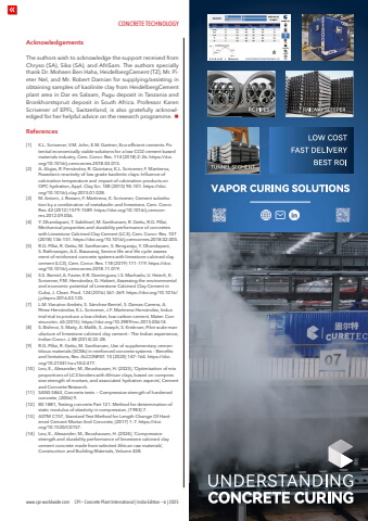 CONCRETE TECHNOLOGYwww.cpi-worldwide.com CPI %u2013 Concrete Plant International | India Edition %u2013 6 | 2025Acknowledgements The authors wish to acknowledge the support received from Chryso (SA), Sika (SA), and AfriSam. The authors specially thank Dr. Mohsen Ben Haha, HeidelbergCement (TZ), Mr. Pieter Nel, and Mr. Robert Damian for supplying/assisting in obtaining samples of kaolinite clay from HeidelbergCement plant area in Dar es Salaam, Pugu deposit in Tanzania and Bronkhorstspruit deposit in South Africa. Professor Karen Scrivener of EPFL, Switzerland, is also gratefully acknowledged for her helpful advice on the research programme. nReferences[1] K.L. Scrivener, V.M. John, E.M. Gartner, Eco-efficient cements: Potential economically viable solutions for a low-CO2 cement-based materials industry, Cem. Concr. Res. 114 (2018) 2%u201326. https://doi.org/10.1016/j.cemconres.2018.03.015.[2] A. Alujas, R. Fern%u00e1ndez, R. Quintana, K.L. Scrivener, F. Martirena, Pozzolanic reactivity of low grade kaolinitic clays: Influence of calcination temperature and impact of calcination products on OPC hydration, Appl. Clay Sci. 108 (2015) 94%u2013101. https://doi.org/10.1016/j.clay.2015.01.028.[3] M. Antoni, J. Rossen, F. Martirena, K. Scrivener, Cement substitution by a combination of metakaolin and limestone, Cem. Concr. Res. 42 (2012) 1579%u20131589. https://doi.org/10.1016/j.cemconres.2012.09.006.[4] Y. Dhandapani, T. Sakthivel, M. Santhanam, R. Gettu, R.G. Pillai, Mechanical properties and durability performance of concretes with Limestone Calcined Clay Cement (LC3), Cem. Concr. Res. 107 (2018) 136%u2013151. https://doi.org/10.1016/j.cemconres.2018.02.005.[5] R.G. Pillai, R. Gettu, M. Santhanam, S. Rengaraju, Y. Dhandapani, S. Rathnarajan, A.S. Basavaraj, Service life and life cycle assessment of reinforced concrete systems with limestone calcined clay cement (LC3), Cem. Concr. Res. 118 (2019) 111%u2013119. https://doi.org/10.1016/j.cemconres.2018.11.019.[6] S.S. Berriel, A. Favier, E.R. Dom%u00ednguez, I.S. Machado, U. Heierli, K. Scrivener, F.M. Hern%u00e1ndez, G. Habert, Assessing the environmental and economic potential of Limestone Calcined Clay Cement in Cuba, J. Clean. Prod. 124 (2016) 361%u2013369. https://doi.org/10.1016/j.jclepro.2016.02.125.[7] L.M. Vizca%u00edno-Andr%u00e9s, S. S%u00e1nchez-Berriel, S. Damas-Carrera, A. P%u00e9rez-Hern%u00e1ndez, K.L. Scrivener, J.F. Martirena-Hern%u00e1ndez, Industrial trial to produce a low clinker, low carbon cement, Mater. Construcci%u00f3n. 65 (2015). https://doi.org/10.3989/mc.2015.00614.[8] S. Bishnoi, S. Maity, A. Mallik, S. Joseph, S. Krishnan, Pilot scale manufacture of limestone calcined clay cement : The Indian experience, Indian Concr. J. 88 (2014) 22%u201328.[9] R.G. Pillai, R. Gettu, M. Santhanam, Use of supplementary cementitious materials (SCMs) in reinforced concrete systems %u2013 Benefits and limitations, Rev. ALCONPAT. 10 (2020) 147%u2013164. https://doi.org/10.21041/ra.v10i2.477.[10] Leo, E., Alexander, M., Beushausen, H. (2023), %u2018Optimisation of mix proportions of LC3 binders with African clays, based on compressive strength of mortars, and associated hydration aspects%u2019, Cement and Concrete Research.[11] SANS 5863, Concrete tests %u2014 Compressive strength of hardened concrete, (2006) 9.[12] BS 1881, Testing concrete Part 121. Method for determination of static modulus of elasticity in compression, (1983) 7.[13] ASTM C157, Standard Test Method for Length Change Of Hardened Cement Mortar And Concrete, (2017) 1%u20137. https://doi.org/10.1520/C0157.[14] Leo, E., Alexander, M., Beushausen, H. (2024), %u2018Compressive strength and durability performance of limestone calcined clay cement concrete made from selected African raw materials%u2019, Construction and Building Materials, Volume 438.