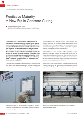 CONCRETE TECHNOLOGY24 CPI %u2013 Concrete Plant International | India Edition %u2013 6 | 2025 www.cpi-worldwide.comFor decades, Kraft Curing has been at the forefront of innovation in concrete curing. The introduction of new cements - using various types of fillers (hydraulic and inert) to replace Portland clinker (in an effort to reduce cement%u2019s CO2 footprint) - is causing producers of precast and prestress elements to question when these products can be demoulded or detensioned without risking damage to the product. To address this issue - as well as the general issue of when a concrete product is suitable for handling - Kraft Curing%u2019s introduction, last year, of Match-Cure technology marks a milestone in quality control for precast and prestress concrete production. Designed as a comprehensive early-strength monitoring system, Match-Cure allows producers of precast and prestress concrete elements to ensure that the freshly poured element achieves the required strength prior to demoulding or tensioning - enabling the earliest possible detensioning or demoulding time, reducing energy and unnecessary labor costs while maintaining safety and product quality that may be a result of inadequate strength development.Test cylinders or cubes, produced as test specimen when a precast or prestress element is poured, are placed into an insulated Match-Cure environmental chamber that allows for precise measurement and control of the test specimen temperature based on (precisely duplicating) the internal temperature of the actual concrete element.As the produced concrete element gains temperature (either though hydration or an accelerated curing system) a heating unit inside the Match-Cure enclosure heats the specimen Predictive Maturity %u2013 A New Era in Concrete CuringKraft Curing Systems GmbH, 49699 Lindern, Germany n Bertrand Delforge, JB Concrete, FranceApril Kraft, Kraft Curing Systems, Kraft Curing Systems GmbH, GermanyIntegration of Match-Cure into Kraft Curing%u2019s AutoCure ecosystem to prevent duplicate control and montoring systems and save money. Match-Cure environmental chambers for a total of five (5) production areas/beds/