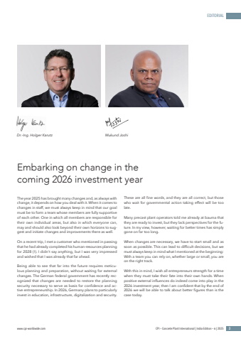 www.cpi-worldwide.com CPI %u2013 Concrete Plant International | India Edition %u2013 6 | 2025 3EDITORIALThe year 2025 has brought many changes and, as always with change, it depends on how you deal with it. When it comes to changes in staff, we must always keep in mind that our goal must be to form a team whose members are fully supportive of each other. One in which all members are responsible for their own individual areas, but also in which everyone can, may and should also look beyond their own horizons to suggest and initiate changes and improvements there as well.On a recent trip, I met a customer who mentioned in passing that he had already completed his human-resources planning for 2028 (!). I didn%u2019t say anything, but I was very impressed and wished that I was already that far ahead. Being able to see that far into the future requires meticulous planning and preparation, without waiting for external changes. The German federal government has recently recognized that changes are needed to restore the planning security necessary to serve as basis for confidence and active entrepreneurship. In 2026, Germany plans to particularly invest in education, infrastructure, digitalization and security. These are all fine words, and they are all correct, but those who wait for governmental action taking effect will be too late.Many precast plant operators told me already at bauma that they are ready to invest, but they lack perspectives for the future. In my view, however, waiting for better times has simply gone on far too long.When changes are necessary, we have to start small and as soon as possible. This can lead to difficult decisions, but we must always keep in mind what I mentioned at the beginning: With a team you can rely on, whether large or small, you are on the right track. With this in mind, I wish all entrepreneurs strength for a time when they must take their fate into their own hands. When positive external influences do indeed come into play in the 2026 investment year, then I am confident that by the end of 2026 we will be able to talk about better figures than is the case today.Embarking on change in the coming 2026 investment yearDr.-Ing. Holger Karutz Mukund Joshi