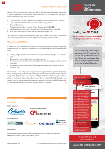 CONCRETE PRODUCTS & CAST STONEwww.cpi-worldwide.com CPI %u2013 Concrete Plant International | India Edition %u2013 6 | 2025FURTHER INFORMATIONwww.iccbp.orgPlatinum sponsorDiamond sponsorsGold sponsorsKBT Machineries, Bengaluru | Kobra Formen GmbH, Germany | Sagar Cements Ltd., Hyderabad SIMEM India , Vadodara | Palfinger India Pvt Ltd., ChennaiInternational media partnerOn April 11, a complimentary plant tour will be offered to the delegates, presenting a typical paver block production at Earth Pavers Pvt. Ltd. In Hyderabad. The equipment operating in this plant includes%u2022 Columbia (India make) SPM30 Concrete Block Machine Pallet size 750x600 : Fully automated plant with Cuber and Kraft Curing System. %u2022 Besser%u2019s Bescopac%u2022 Parijatha (India make) Hermetic Press - 3 stations (APM316 ED)%u2022 KBT Machinery (India make) Vacuum Wet Press Single Station - WP400%u2022 Shot Blast Machine from Patel Furnace and Forging Pvt. Ltd.This exclusive tour will provide Indian make equipment, with a mix of automated and manual processes to produce different block and paver products.Why Attend ICCBP 2026?ICCBP is not just a scientific conference%u2014it is a global meeting place for innovators, manufacturers, city planners, researchers, and policy-makers. Participants benefit from:%u2022 Cutting-edge research presentations covering materials, design, and sustainability.%u2022 Best practice case studies from around the world.%u2022 An international exhibition showcasing the latest technologies, machines, and materials.%u2022 Networking opportunities with leading experts shaping the future of urban infrastructure.Hyderabad, as a rapidly expanding metropolis, provides the perfect backdrop. Here, urban growth, sustainability challenges, and infrastructure development converge, reflecting the core issues addressed by ICCBP. The ICCBP Congress will take place in the Novotel Hyderabad Convention Centre Novotel & HICC Complex and special rates for conference participants are agreed that are accessible through the ICCBP website where you can also register online, of course. nCONCRETE PLANTINTERNATIONALTRADE JOURNALS FOR THE CONCRETE INDUSTRYAsk me a question.Hello, i%u00b4m CPi Chat!What is recycled concrete?Recycled concrete aggregates (RCA) are concrete waste that can be classified as fine recycled concrete aggregates (fRCA) and coarse recycled concrete aggregates (cRCA). RCA is typically free of masonry or brick components of construction and demolition waste (C&DW), as these materials have porous microstructures that significantly affect the properties of RCA [1]. RCA can be simplified as a two-phase composite material...This link will take you directly to the article:%u2022 [1] The use of recycled aggregates to produce concrete productsHello, i%u00b4mthe AI chatbot from CPI worldwide for the precast concrete industryI%u2018m an intelligent search engine and expert in all CPI contents. You can ask me questions and talk to me. I%u2018ll use our knowledge database to give you specific answers to this and all other CPI articles. www.cpi-worldwide.comTest the CPI Chat and visit our website: