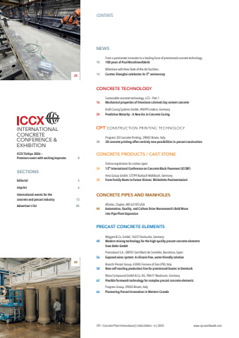 CPI %u2013 Concrete Plant International | India Edition %u2013 6 | 2025 www.cpi-worldwide.comCONTENTSNEWSFrom a passionate innovator to a leading force of prestressed concrete technology10 100 years of Paul MaschinenfabrikMilestone with New State-of-the-Art Facilities14 Curetec Shanghai celebrates its 5th anniversaryCONCRETE TECHNOLOGYSustainable concrete technology, LC3 %u2013 Part 116 Mechanical properties of limestone calcined clay cement concrete Kraft Curing Systems GmbH, 49699 Lindern, Germany 24 Predictive Maturity %u2013 A New Era in Concrete CuringProgress 3D Concrete Printing, 39042 Brixen, Italy30 3D concrete printing offers entirely new possibilities in precast constructionCONCRETE PRODUCTS / CAST STONEOnline registration for visitors open34 13th International Conference on Concrete Block Pavement (ICCBP)Hess Group GmbH, 57299 Burbach-Wahlbach, Germany38 From Family Roots to Future Visions: Micheletto PavimentazioniCONCRETE PIPES AND MANHOLESAfinitas, Clayton, MO 63105 USA44 Automation, Quality, and Culture Drive Nansemond%u2019s Bold Move into Pipe Plant ExpansionPRECAST CONCRETE ELEMENTSWiggert & Co. GmbH, 76227 Karlsruhe, Germany 48 Modern mixing technology for the high-quality precast concrete elements from Befer GmbHPrensoland S.A., 08592 Sant Mart%u00ed de Centelles, Barcelona, Spain56 Exposed wires system: A silicosis-free, water-friendly solutionBianchi Precast Group, 43045 Fornovo di Taro (PR), Italy58 New self-reacting production line for prestressed beams in DenmarkWasa Compound GmbH & Co. KG, 98617 Neubrunn, Germany62 Flexible formwork technology for complex precast concrete elementsProgress Group, 39042 Brixen, Italy66 Pioneering Precast Innovation in Western Canada4424ICCX T%u00fcrkiye 2026 %u2013 Premiere event with exciting keynotes 8SECTIONSEditorial 3Imprint 6International events for the concrete and precast industry 13Advertiser%u2019s list 85INTERNATIONAL CONCRETECONFERENCE & EXHIBITION