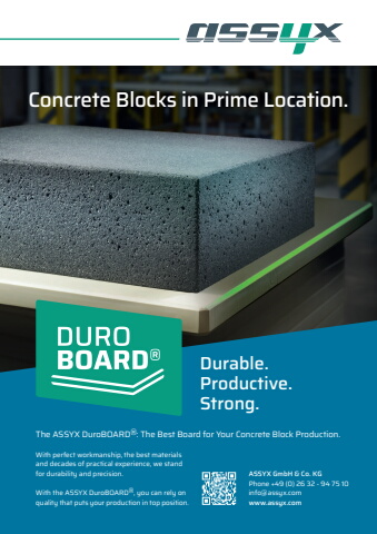 Durable.Productive.Strong.ASSYX GmbH & Co. KGPhone +49 (0) 26 32 - 94 75 10info@assyx.comwww.assyx.comWith perfect workmanship, the best materials and decades of practical experience, we stand for durability and precision.With the ASSYX DuroBOARD%u00ae, you can rely on quality that puts your production in top position.The ASSYX DuroBOARD%u00ae: The Best Board for Your Concrete Block Production.Concrete Blocks in Prime Location.