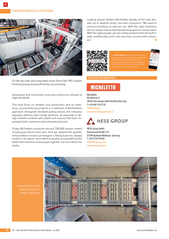 CONCRETE PRODUCTS & CAST STONE42 CPI %u2013 Concrete Plant International | India Edition %u2013 6 | 2025 www.cpi-worldwide.comFURTHER INFORMATIONMichelettoVia Desman 4, 35010 San Giorgio delle Pertiche (Pd), ItalyT +39 049 5747139info@micpav.itwww.michelettopavimenti.itHESS Group GmbH Freier-Grund-Stra%u00dfe 123 57299 Burbach-Wahlbach, Germany T +49 2736 49760 info@hessgroup.com www.hessgroup.comThe HESS GROUP sponsored the free download possibility of the pdf of this article for all readers of CPI. Please check the website www.cpi-worldwide.com/channels/topwerk or scan the QR code with your smartphone to get direct access to this website.developed and introduced, ensuring continuous renewal at high standards.This dual focus on reliable core production and on ambitious, unconventional projects is a hallmark of Micheletto%u2019s approach. Alongside standard paving stones, the company regularly delivers tailor-made solutions. Its expertise in design enables surfaces with depth and nuance that have impressed both customers and international juries.Today, Micheletto produces around 700,000 square meters of paving products each year. And yet, despite this growth, its foundation remains unchanged: a family business, deeply rooted in its region, committed to quality, and guided by the belief that machines and people together can turn ideas into reality.Looking ahead, Stefano Micheletto speaks of the next decade not in abstract terms, but with conviction: %u201cWe want to continue building on who we are. With the right machines, we can realize visions that standard equipment cannot reach. With the right people, we can create products that last technically, aesthetically, and in the way they connect with customers.%u201d nOn the dry side, the automated cuber Servo Pak 700-2 stacks finished paving stones efficiently and precisely.Cured blocks on the latch conveyor for further handling.