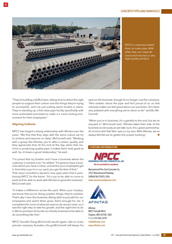 CONCRETE PIPES AND MANHOLESwww.cpi-worldwide.com CPI %u2013 Concrete Plant International | India Edition %u2013 6 | 2025 47%u201cThey%u2019re building a skillful team, taking time to select the right people to support their culture and the things they%u2019re trying to accomplish, and not just putting warm bodies in place. They%u2019re standing up a first-class pipe facility specifically with more automated processes to make it a more inviting environment for their employees.%u201dAligning CulturesNPCC has forged a strong relationship with Afinitas over the years. %u201cWe find that they align with the same culture we try to achieve and improve on daily,%u201d McConnell said. %u201cWorking with a group like Afinitas, you%u2019re after a certain quality, and they appreciate that. At the end of the day, when that machine is producing quality pipe, it makes them look good as well. So, it%u2019s been a good relationship,%u201d he said. %u201cI%u2019m proud that my brother and I have a business where the customer is number one,%u201d he added. %u201cIt%u2019s great to have a business where you have a vision, and where your employees get it. And when you%u2019re in our yard, you get the feel of that.%u201d That vision included a dynamic new pipe plant that is positioning NPCC for the future. %u201cIt%u2019s a joy to be able to come to work and be able to work with Afinitas to grow the business,%u201d McConnell said. %u201cIt makes a difference across the yard. When your employees know that you%u2019re doing positive things, they%u2019re positive. That%u2019s why I love this business. Being able to provide for our employees and watch them grow, that%u2019s enough for me. It completes the circle of what we want to do service-wise, so it was the right step to take for growth, and the right time to do it. We%u2019ve just been fortunate as a family business to be able to do something like that.%u201dNPCC founder Doug McConnell would agree. Like so many precast company founders, Doug McConnell still keeps his eyes on the business, though he no longer runs the company. %u201cHe%u2019s ecstatic about the pipe and he%u2019s proud of us, so that certainly makes me feel good about our purchase. He%u2019s been very pleased with everything we%u2019ve done so far%u201d said Bo McConnell. %u201cWhen you%u2019re in business, it%u2019s a gamble to the end, but we%u2019ve enjoyed it,%u201d McConnell said. %u201cAfinitas takes their side of the business as seriously as we take ours. It%u2019s a great partnership. At no time did I feel like I was on my own. With Afinitas, we%u2019ve always felt like we%u2019ve gotten the proper backing.%u201d nFURTHER INFORMATIONNansemond Pre-Cast Concrete Co.3737 Nansemond ParkwaySuffolk VA 23435, USAwww.nansemondprecast.comAfinitas8027 Forsyth BlvdClayton, MO 63105, USAT +1 319-394-3197info@afinitas.comwww.afinitas.comNPCC%u2019s customers asked them to make pipe. With ePak, they can meet demand and maintain a very high-quality product.