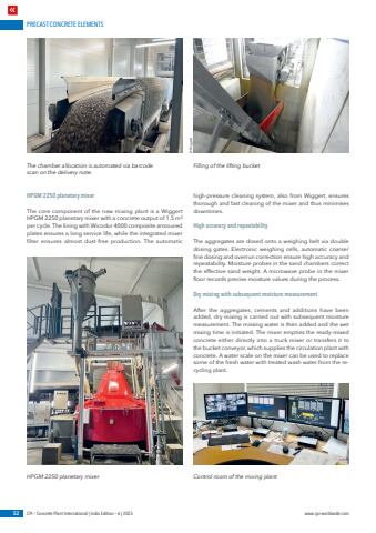 PRECAST CONCRETE ELEMENTS52 CPI %u2013 Concrete Plant International | India Edition %u2013 6 | 2025 www.cpi-worldwide.comHPGM 2250 planetary mixerThe core component of the new mixing plant is a Wiggert HPGM 2250 planetary mixer with a concrete output of 1.5 m%u00b3 per cycle. The lining with Wicodur 4000 composite armoured plates ensures a long service life, while the integrated mixer filter ensures almost dust-free production. The automatic high-pressure cleaning system, also from Wiggert, ensures thorough and fast cleaning of the mixer and thus minimises downtimes.High accuracy and repeatabilityThe aggregates are dosed onto a weighing belt via double dosing gates. Electronic weighing cells, automatic coarse/fine dosing and overrun correction ensure high accuracy and repeatability. Moisture probes in the sand chambers correct the effective sand weight. A microwave probe in the mixer floor records precise moisture values during the process.Dry mixing with subsequent moisture measurementAfter the aggregates, cements and additions have been added, dry mixing is carried out with subsequent moisture measurement. The missing water is then added and the wet mixing time is initiated. The mixer empties the ready-mixed concrete either directly into a truck mixer or transfers it to the bucket conveyor, which supplies the circulation plant with concrete. A water scale on the mixer can be used to replace some of the fresh water with treated wash water from the recycling plant.The chamber allocation is automated via barcode scan on the delivery note.Filling of the lifting bucket%u00a9WiggertHPGM 2250 planetary mixer Control room of the mixing plant
