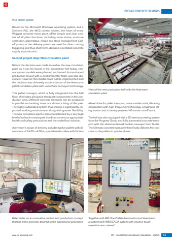 PRECAST CONCRETE ELEMENTSwww.cpi-worldwide.com CPI %u2013 Concrete Plant International | India Edition %u2013 6 | 2025 53WCS control systemBased on the Microsoft Windows operating system and a Siemens PLC, the WCS control system, the heart of every Wiggert concrete mixer plant, offers simple and clear control of all plant functions, including mixer status, moisture correction, plant status, recipe and stock management. Calloff points at the delivery points are used for direct mixing triggering and thus short-term, demand-orientated concrete supply in production.Second project step: New circulation plantBefore the decision was made to realise the new circulation plant as it can be found in the production hall today, various system models were planned and tested. A star-shaped production layout with a central transfer table was also discussed. However, this model could not be implemented and the decision was ultimately made in favour of the Avermann pallet circulation plant with underfloor conveyor technology.This pallet conveyor, which is fully integrated into the hall floor, eliminates disruptive transport components in the production area. Different concrete elements can be produced in parallel and waiting times are almost a thing of the past. The highly automated system thus creates a significantly improved working environment along with greater flexibility. The new circulation plant is also characterised by a very high level of safety for employees thanks to numerous appropriate health and safety precautions and the underfloor solution.Avermann's scope of delivery includes twelve pallets with dimensions of 14.00 %u00d7 4.00 m, special trestle rollers with friction wheel drive for pallet transport, cross transfer units, vibrating compactors with high-frequency technology, a hydraulic tilting station and a battery-powered 40-tonne run-off truck.The hall was also equipped with a 3D steel processing system from the Progress Group and fully automated concrete transport with the aforementioned bucket conveyor from Dudik. The Elematic concrete spreader then finally delivers the concrete to the pallets in precise doses.View of the new production hall with the Avermann circulation plantBefer relies on an innovative control and production concept that has been precisely tailored to the operational processes. Together with RIB One Prefab Automation and Avermann, a customised HMI/SCADA system with intuitive touch operation was created.