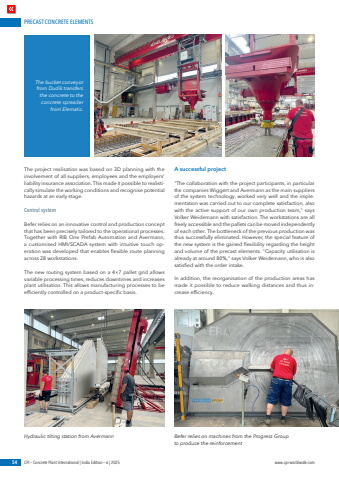 PRECAST CONCRETE ELEMENTS54 CPI %u2013 Concrete Plant International | India Edition %u2013 6 | 2025 www.cpi-worldwide.comThe project realisation was based on 3D planning with the involvement of all suppliers, employees and the employers' liability insurance association. This made it possible to realistically simulate the working conditions and recognise potential hazards at an early stage.Control systemBefer relies on an innovative control and production concept that has been precisely tailored to the operational processes. Together with RIB One Prefab Automation and Avermann, a customised HMI/SCADA system with intuitive touch operation was developed that enables flexible route planning across 28 workstations.The new routing system based on a 4%u00d77 pallet grid allows variable processing times, reduces downtimes and increases plant utilisation. This allows manufacturing processes to be efficiently controlled on a product-specific basis.A successful project\the companies Wiggert and Avermann as the main suppliers of the system technology, worked very well and the implementation was carried out to our complete satisfaction, also with the active support of our own production team,\Volker Weidemann with satisfaction. The workstations are all freely accessible and the pallets can be moved independently of each other. The bottleneck of the previous production was thus successfully eliminated. However, the special feature of the new system is the gained flexibility regarding the height and volume of the precast elements. \already at around 80%,\satisfied with the order intake.In addition, the reorganisation of the production areas has made it possible to reduce walking distances and thus increase efficiency.Hydraulic tilting station from Avermann Befer relies on machines from the Progress Group to produce the reinforcementThe bucket conveyor from Dudik transfers the concrete to the concrete spreader from Elematic.