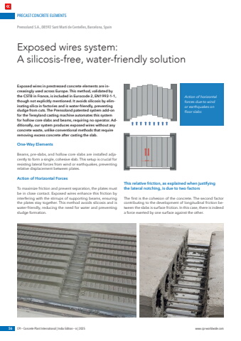 PRECAST CONCRETE ELEMENTS56 CPI %u2013 Concrete Plant International | India Edition %u2013 6 | 2025 www.cpi-worldwide.comExposed wires in prestressed concrete elements are increasingly used across Europe. This method, validated by the CSTB in France, is included in Eurocode 2, EN1992-1-1, though not explicitly mentioned. It avoids silicosis by eliminating silica in factories and is water-friendly, preventing sludge from cuts. The Prensoland patented system add-on for the Tensyland casting machine automates this system for hollow core slabs and beams, requiring no operator. Additionally, our system produces exposed wires without any concrete waste, unlike conventional methods that require removing excess concrete after casting the slab. One-Way ElementsBeams, pre-slabs, and hollow core slabs are installed adjacently to form a single, cohesive slab. This setup is crucial for resisting lateral forces from wind or earthquakes, preventing relative displacement between plates. Action of Horizontal ForcesTo maximize friction and prevent separation, the plates must be in close contact. Exposed wires enhance this friction by interfering with the stirrups of supporting beams, ensuring the plates stay together. This method avoids silicosis and is water-friendly, reducing the need for water and preventing sludge formation. This relative friction, as explained when justifying the lateral notching, is due to two factorsThe first is the cohesion of the concrete. The second factor contributing to the development of longitudinal friction between the slabs is surface friction. In this case, there is indeed a force exerted by one surface against the other.Exposed wires system: A silicosis-free, water-friendly solutionPrensoland S.A., 08592 Sant Mart%u00ed de Centelles, Barcelona, SpainAction of horizontal forces due to wind or earthquakes on floor slabs