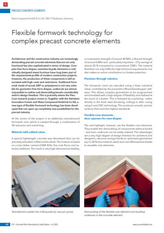 PRECAST CONCRETE ELEMENTS62 CPI %u2013 Concrete Plant International | India Edition %u2013 6 | 2025 www.cpi-worldwide.comArchitecture and the construction industry are increasingly demanding precast concrete elements that are not only functional but also sophisticated in terms of design. Complex free-form shapes, seamless fa%u00e7ade elements or individually designed street furniture have long been part of the requirements profile of modern construction projects. However, the production of these components is still associated with high costs and restrictions. Traditional formwork made of wood, GRP or polystyrene is not very suitable for geometric free-form shapes, undercuts are almost impossible to realise and demoulding bevels considerably restrict design freedom. This is precisely where the FlexCore research project comes in. Together with the Steinbeis Innovation Centre and Wasa Compound GmbH & Co KG, a new type of flexible formwork technology has been developed that can open up completely new possibilities for the precast industry.At the centre of the project is an additively manufactured formwork core, which is created through a combination of 3D extrusion and machining.Material with added valueA special lightweight concrete was developed that can be precisely extruded, milled and brushed. The mixture is based on a low-clinker cement (CEM III/A), fine rock flours and selected additives. The result is very high dimensional stability, a compressive strength of around 40 MPa, a flexural strength of around 6 MPa and - particularly important - CO2 savings of almost 50 % compared to conventional CEM I. The material therefore not only fulfils the high technical requirements, but also makes an active contribution to climate protection.Precision through roboticsThe formwork cores are extruded using a Kuka industrial robot, controlled by the parametric Rhino/Grasshopper software. This allows complex geometries to be programmed and simulated with a high degree of flexibility and realised at the touch of a button. This is followed by machining - either directly in the fresh state (brushing, milling) or after curing using 5-axis CNC technology. This produces smooth, precise surfaces that meet the highest standards.Flexible core elements %u2013 door openers for new shapesThe real highlight, however, are the flexible core elements. They enable the demoulding of components without bevels - and even undercuts can be easily realised. The advantages are a very high degree of design freedom for architects and designers, resource savings thanks to optimised geometries (up to 30 % less material used) and cost-effectiveness thanks to reusable core elements.Flexible formwork technology for complex precast concrete elementsWasa Compound GmbH & Co. KG, 98617 Neubrunn, GermanyTest element sucked into milling area by vacuum pump. Demoulding of the flexible core element and resulting undercuts in the concrete element