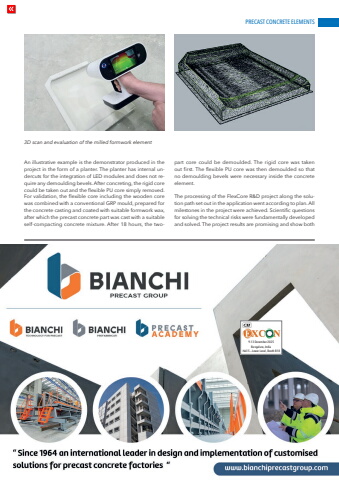 PRECAST CONCRETE ELEMENTSwww.cpi-worldwide.com CPI %u2013 Concrete Plant International | India Edition %u2013 6 | 2025 639-13 December 2025Bengaluru, IndiaHall 5 %u2013 Lower Level, Booth B18An illustrative example is the demonstrator produced in the project in the form of a planter. The planter has internal undercuts for the integration of LED modules and does not require any demoulding bevels. After concreting, the rigid core could be taken out and the flexible PU core simply removed.For validation, the flexible core including the wooden core was combined with a conventional GRP mould, prepared for the concrete casting and coated with suitable formwork wax, after which the precast concrete part was cast with a suitable self-compacting concrete mixture. After 18 hours, the twopart core could be demoulded. The rigid core was taken out first. The flexible PU core was then demoulded so that no demoulding bevels were necessary inside the concrete element.The processing of the FlexCore R&D project along the solution path set out in the application went according to plan. All milestones in the project were achieved. Scientific questions for solving the technical risks were fundamentally developed and solved. The project results are promising and show both 3D scan and evaluation of the milled formwork element