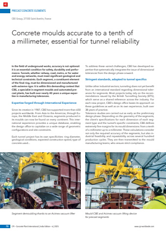 PRECAST CONCRETE ELEMENTS70 CPI %u2013 Concrete Plant International | India Edition %u2013 6 | 2025 www.cpi-worldwide.comIn the field of underground works, accuracy is not optional: it is an essential condition for safety, durability and performance. Tunnels, whether railway, road, metro, or for water and energy networks, must meet significant geological and technical constraints. Each segment, a constituent element of the final ring, must be dimensioned and manufactured with extreme rigor. It is within this demanding context that CBE, a specialist in segment moulds and automated precast plants, has built over nearly 40 years a unique expertise in manufacturing tolerances.Expertise forged through International ExperienceSince its creation in 1987, CBE has supported more than 650 projects worldwide. From Asia to the Americas, through Europe, the Middle East and Oceania, segments produced in its moulds can now be found on every continent. This international experience provides a unique database, enabling the design office to capitalize on a wide range of geometric configurations and site constraints.Each tunnel project has its own specificities: ring diameter, geological conditions, expected construction speed, type of concrete used... To address these varied challenges, CBE has developed expertise that systematically integrates the issue of dimensional tolerances from the design phase onward.Stringent standards, adapted to tunnel specificsUnlike other industrial sectors, tunneling does not yet benefit from an international standard regarding dimensional tolerances for segments. Most projects today rely on the recommendations issued by the British Tunnelling Society (BTS), which serve as a shared reference across the industry. For each new project, CBE%u2019s design office bases its approach on these guidelines as well as on its own experience, built over 38 years of practice.Tolerance studies are carried out as early as the preliminary design phase. Depending on the geometry of the segments, the client%u2019s specifications for each dimension of each segment type and the tunnel%u2019s specific constraints, CBE defines extremely fine margins for its mould dimensions: from a tenth of a millimeter up to a millimeter. These calculations consider not only the required accuracy of the segments, but also industrial feasibility and repeatability across several hundred production cycles. They are then transmitted to the mould manufacturing teams, who ensure strict compliance.Concrete moulds accurate to a tenth of a millimeter, essential for tunnel reliabilityCBE Group, 37550 Saint Avertin, France Segment demoulding thanks to an Acimex vacuum lifter Mould CBE and Acimex vacuum lifting device for precast segments