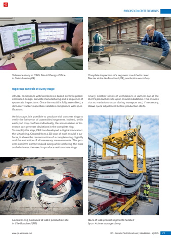 PRECAST CONCRETE ELEMENTSwww.cpi-worldwide.com CPI %u2013 Concrete Plant International | India Edition %u2013 6 | 2025 71Rigorous controls at every stageAt CBE, compliance with tolerances is based on three pillars: controlled design, accurate manufacturing and a sequence of systematic inspections. Once the mould is fully assembled, a 3D Laser Tracker inspection validates compliance with specifications.At this stage, it is possible to produce trial concrete rings to verify the behavior of assembled segments. Indeed, while each part may conform individually, the accumulation of tolerance can generate deviations in the complete ring.To simplify this step, CBE has developed a digital innovation: the virtual ring. Created from a 3D scan of each mould%u2019 s surfaces, it allows the reconstruction of a complete ring digitally and the extraction of all necessary measurements. This process confirms correct mould sizing while archiving the data and eliminates the need to produce real concrete rings.Finally, another series of verifications is carried out at the client%u2019s production site upon mould installation. This ensures that no variations occur during transport and, if necessary, allows quick adjustment before production starts.Concrete ring produced at CBE%u2019s production site in L%u2019Ile-Bouchard (FR)Stack of CBE precast segments handled by an Acimex storage clampTolerance study at CBE%u2019s Mould Design Office in Saint-Avertin (FR)Complete inspection of a segment mould with Laser Tracker at the Ile-Bouchard (FR) production workshop