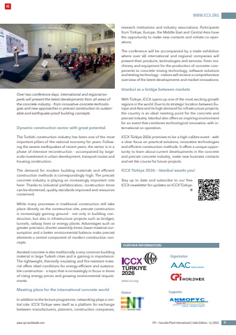WWW.ICCX.ORGwww.cpi-worldwide.com CPI %u2013 Concrete Plant International | India Edition %u2013 6 | 2025 9Dynamic construction sector with great potentialThe Turkish construction industry has been one of the most important pillars of the national economy for years. Following the severe earthquakes of recent years, the sector is in a phase of intensive reconstruction - accompanied by largescale investment in urban development, transport routes and housing construction.The demand for modern building materials and efficient construction methods is correspondingly high. The precast concrete industry is playing an increasingly important role here: Thanks to industrial prefabrication, construction times can be shortened, quality standards improved and resources conserved.While many processes in traditional construction still take place directly on the construction site, precast construction is increasingly gaining ground - not only in building construction, but also in infrastructure projects such as bridges, tunnels, railway lines or energy plants. Advantages such as greater precision, shorter assembly times, lower material consumption and a better environmental balance make precast elements a central component of modern construction concepts.Aerated concrete is also traditionally a very common building material in large Turkish cities and is gaining in importance: The lightweight, thermally insulating and fire-resistant material offers ideal conditions for energy-efficient and sustainable construction - a topic that is increasingly in focus in times of rising energy prices and growing environmental requirements.Meeting place for the international concrete worldIn addition to the lecture programme, networking plays a central role. ICCX T%u00fcrkiye sees itself as a platform for exchange between manufacturers, planners, construction companies, research institutions and industry associations. Participants from T%u00fcrkiye, Europe, the Middle East and Central Asia have the opportunity to make new contacts and initiate co-operations.The conference will be accompanied by a trade exhibition where over 60 international and regional companies will present their products, technologies and services. From machinery and equipment for the production of concrete components to concrete mixing technology, software solutions and testing technology - visitors will receive a comprehensive overview of the latest developments and market innovations.Istanbul as a bridge between marketsWith T%u00fcrkiye, ICCX opens up one of the most exciting growth regions in the world. Due to its strategic location between Europe and Asia and its high demand for infrastructure projects, the country is an ideal meeting point for the concrete and precast industry. Istanbul also offers an inspiring environment for an event that combines technological innovation with international co-operation.ICCX T%u00fcrkiye 2026 promises to be a high-calibre event - with a clear focus on practical solutions, innovative technologies and efficient construction methods. It offers a unique opportunity to learn about current developments in the concrete and precast concrete industry, make new business contacts and set the course for future projects.ICCX T%u00fcrkiye 2026 %u2013 Istanbul awaits you!Stay up to date and subscribe to our free ICCX newsletter for updates on ICCX T%u00fcrkiye.nFURTHER INFORMATIONwww.iccx.orgT%u00dcRKIYE2026PartnerOrganisationOver two conference days, international and regional experts will present the latest developments from all areas of the concrete industry - from innovative concrete technologies and new approaches in precast construction to sustainable and earthquake-proof building concepts.Supporter