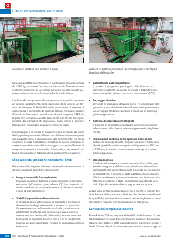 ELEMENTI PREFABBRICATI IN CALCESTRUZZO102 C&PI %u2013 Calcestruzzo & Prefabbricazione International %u2013 6 | 2025 www.cpi-worldwide.comLa nuova piattaforma elevatrice a pantografo con una portata di 1.000 kg consente l'accesso tra le tavole. Due estensioni elettromeccaniche di un metro ciascuna sui lati frontali aumentano la sicurezza sul lavoro e facilitano l'utilizzo.L'utilizzo di componenti di casseratura magnetici consente un rapido adattamento dello spessore delle pareti, un fattore decisivo per la flessibilit%u00e0 nella produzione. Il sistema di casseratura %u00e8 composto da sponde laterali modulari, casseri di fondo e fermagetti centrali con sistemi magnetici SPB integrati che vengono rivestiti dal cliente con tavole di legno, nonch%u00e9 da componenti aggiuntivi, quali listelli a sezione triangolare, prolunghe angolari e casse di rialzo. Il montaggio e la messa in funzione sono avvenuti da parte dell%u2019apposito personale di Ratec in collaborazione con operai specializzati messi a disposizione dal committente. La fossa esistente %u00e8 stata riutilizzata e adattata al nuovo impianto di casseratura. Al termine del montaggio sono stati effettuati la messa in funzione e il controllo funzionale, compreso il collaudo preliminare in fabbrica della piattaforma elevatrice.Sfida superata: precisione nonostante i limitiNel corso del progetto si %u00e8 reso necessario tenere conto di diverse esigenze specifiche del cliente:%u2022 Integrazione nella fossa esistenteIl nuovo cassero in batteria %u00e8 stato integrato nella fossa esistente dell'impianto precedente. Ci%u00f2 ha consentito di riutilizzare l'infrastruttura esistente e di ridurre al minimo i costi di ristrutturazione.%u2022 Stabilit%u00e0 e precisione dimensionaleA causa degli elevati requisiti di planarit%u00e0 e precisione dimensionale degli elementi in calcestruzzo prodotti, il cassero %u00e8 stato realizzato in modo da garantire una particolare resistenza alla torsione. Le tavole sono rivestite con una lamiera di 10 mm di spessore, con una tolleranza di planarit%u00e0 da %u00b11,5 mm a 3 m di lunghezza. Questa versione garantisce risultati di produzione precisi e duraturi.%u2022 Calcestruzzo autocompattanteIl cassero %u00e8 progettato per il getto del calcestruzzo dall'alto e soddisfa i requisiti di tenuta e stabilit%u00e0 nella lavorazione del calcestruzzo autocompattante (SCC).%u2022 Serraggio idraulicoUn'unit%u00e0 di serraggio idraulica con 2 %u00d7 4 cilindri per lato garantisce una distribuzione uniforme della pressione e un serraggio affidabile durante il processo di betonaggio e stagionatura. %u2022 Sistema di casseratura intelligenteIl sistema di casseratura modulare consente un rapido adattamento alle diverse altezze e geometrie degli elementi.%u2022 Regolazione continua dello spessore delle paretiGrazie all'impiego di rialzi angolari variabili e casse di rialzo %u00e8 possibile realizzare spessori di parete da 100 mm a 250 mm, in modo continuo e senza tempi di conversione aggiuntivi.%u2022 Uso ergonomicoL'utilizzo e l'accesso al cassero sono facilitati dalle passerelle integrate e dalla nuova piattaforma elevatrice a pantografo che aumentano sia la sicurezza sul lavoro che la produttivit%u00e0. Il cassero %u00e8 stato adattato con precisione alla fossa esistente e, in combinazione con la nuova piattaforma elevatrice, %u00e8 stato completato diventando un'unit%u00e0 di produzione moderna, ergonomica e sicura.Grazie alla stretta collaborazione tra il cliente e il team tecnico, %u00e8 stata elaborata una soluzione che tiene conto di tutte le specifiche relative alla sicurezza, come ringhiere, accessi alle scale e requisiti dell'associazione di categoria.Conclusioni complessive positive Franz-Rainer G%u00f6hrle, responsabile dello stabilimento di prefabbricazione in Glass, trae conclusioni positive: %u201cLa collaborazione con Ratec %u00e8 stata assolutamente piacevole, a tutti i livelli. Come clienti ci siamo sempre sentiti a nostro agio e Cassero in batteria con pedane e scala Cassero in batteria con bracci di serraggio per il serraggio idraulico delle tasche