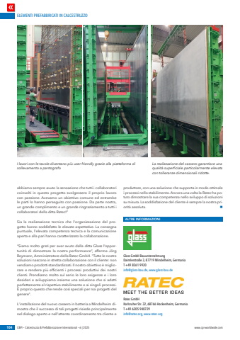 ELEMENTI PREFABBRICATI IN CALCESTRUZZO104 C&PI %u2013 Calcestruzzo & Prefabbricazione International %u2013 6 | 2025 www.cpi-worldwide.comabbiamo sempre avuto la sensazione che tutti i collaboratori coinvolti in questo progetto svolgessero il proprio lavoro con passione. Avevamo un obiettivo comune ed entrambe le parti lo hanno perseguito con passione. Da parte nostra, un grande complimento e un grande ringraziamento a tutti i collaboratori della ditta Ratec!%u201d Sia la realizzazione tecnica che l'organizzazione del progetto hanno soddisfatto le elevate aspettative. La consegna puntuale, l'elevata competenza tecnica e la comunicazione aperta e alla pari hanno caratterizzato la collaborazione. %u201cSiamo molto grati per aver avuto dalla ditta Glass l%u2019opportunit%u00e0 di dimostrare la nostra performance%u201d, afferma J%u00f6rg Reymann, Amministratore della Ratec GmbH. \soluzioni nascono in stretta collaborazione con il cliente: non vendiamo prodotti standardizzati. Il nostro obiettivo %u00e8 migliorare e rendere pi%u00f9 efficienti i processi produttivi dei nostri clienti. Prendiamo molto sul serio le loro esigenze e i loro desideri e sviluppiamo insieme una soluzione che si adatti perfettamente al rispettivo stabilimento e ai singoli processi. %u00c8 proprio questo che rende cos%u00ec speciali per noi progetti del genere\L'installazione del nuovo cassero in batteria a Mindelheim dimostra che il successo di tali progetti risiede principalmente nel dialogo aperto e nell'attento coordinamento tra cliente e produttore, con una soluzione che supporta in modo ottimale i processi nello stabilimento. Ancora una volta la Ratec ha potuto dimostrare la sua competenza nello sviluppo di soluzioni su misura. La soddisfazione del cliente %u00e8 sempre la nostra priorit%u00e0 assoluta. nALTRE INFORMAZIONIGlass GmbH Bauunternehmung Daimlerstra%u00dfe 3, 87719 Mindelheim, GermaniaT +49 8261 9920 info@glass-bau.de, www.glass-bau.deRatec GmbH Karlsruher Str. 32, 68766 Hockenheim, Germania T +49 6205 940729 info@ratec.org, www.ratec.orgLa realizzazione del cassero garantisce una qualit%u00e0 superficiale particolarmente elevata con tolleranze dimensionali ridotte.I lavori con le tavole diventano pi%u00f9 user friendly grazie alla piattaforma di sollevamento a pantografo